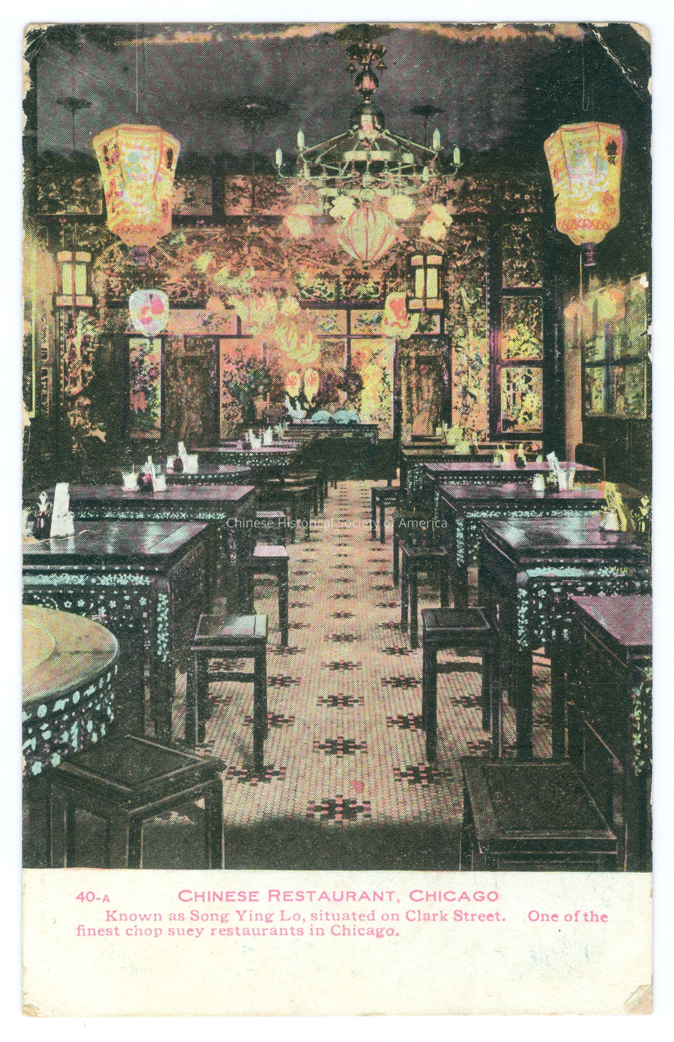 Front: Caption: "40-A Chinese Restaurant, Chicago Known as Song Ying Lo, situated on Clark Street. One of the finest chop suey restaurants in Chicago." Back: Postmark: "Chicago, Ill. May 22 1908 1:30 AM", stamped in black. Stamp: A green once cent stamp with Benjamin Franklin. Message: "5/21/08 Dear Ruth: - This is a regular Chinese Restaurant. How funny it looks. There are so many things to see when you come down. I hope Xenia can come too with your ma and yourself. Give my love to your grandma and grandpa, also yourselves. Your aunt Kate"; "Ruth Regan, 118-....."