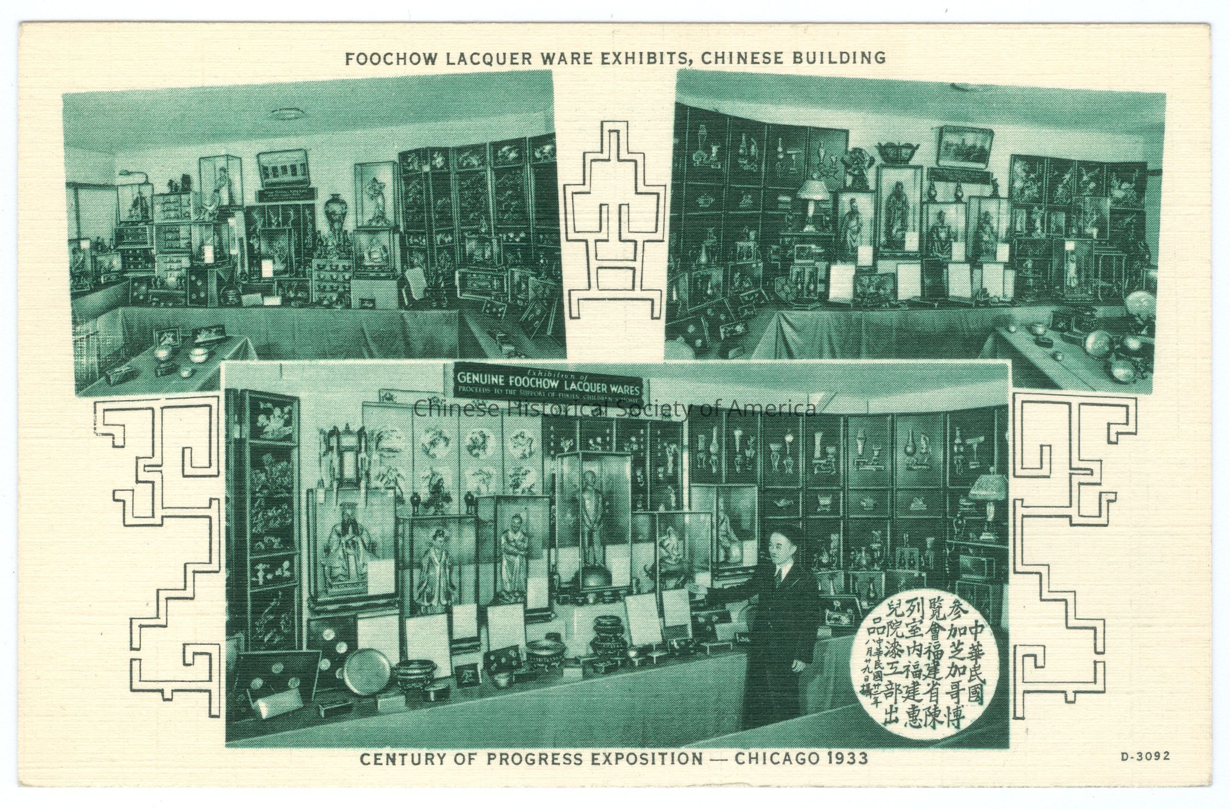 Front: Caption: "Foochow Lacquer Ware Exhibits, Chinese Building; Century of Progress Exposition-Chicago 1933." "D-3092." Back: Info. Text: "The Picture Shows Beautiful Exhibits of Genuine Foochow Lacquer Ware Made by Fukien Children's Home in the Chinese Building at A Century of Progress Exposition, Chicago. Fukien Children's Home was founded in 1923 in Foochow, by H. F. Tung and Y. L. Cheng, two young Chinese students. The Home had only 4 students when it was first founded and today the enrollment runs more than 300, ranging in age from 7 to 19 years. They are taught along the principle of Productive Education. The Lacquer Dept. had manufactured especially for A Century of Progress Exposition the following groups of exhibits: (1) Historical Statues, such as the ten great men of China, from Huang-Ti, the first Emperor to Sun Yat Sen, the first President of China. (2) Art Objects, such as lacquer screens of calissic designs, hand carved teakwood screens with stories dated back to Confucius' time, Oriental Beauty, Spirit of Flowers, etc. (3) Daily Utility Articles, such as nested tables, trays, boxes, desk, sets, tea sets, flower vases, etc. The Proviincial Government of Fukien has awarded the honor to Fukien Children's Home for its exhibits of merits and appointed H. F. Tung, as chief delegate to the Century of Progress Exposition. Mr. Tung is shown in this picture."; "'C. T. Art-Gravure', Made only by Curt Teich & Co., Inc., Chicago, U.S.A." Old Accession #: N)-