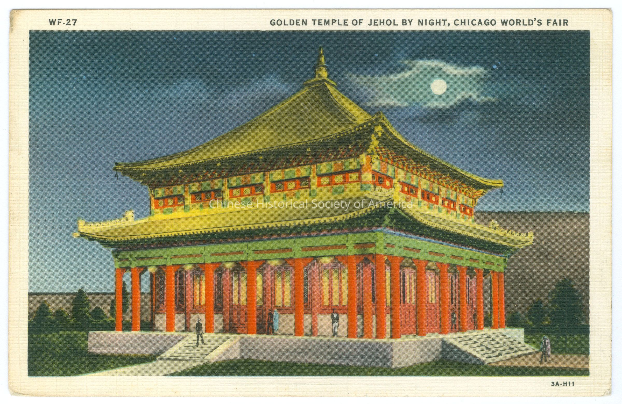 Front: Caption: "WF-27 Golden Temple of Jehol By Night, Chicago World's Fair." "3A-H11." Back: Info. Text: "Golden Temple of Jehol, Replica of the celebrated Chinese Lama Temple is the gift to the Exposition of Vincent Bendix. The Golden Pavilion, seat of worship of the Manchu emperors, was copied faithfully by North Chinese architects and artisans, shipped in 28,000 pieces to Chicago and put together like the parts of some huge Chinese puzzle."; "WF-27 Max Rigot Selling Co., Chicago"; "C. T. Art-Colortone"; "1833 Century of Progress Chicago World's Fair 1933" Old Accession #: A)-