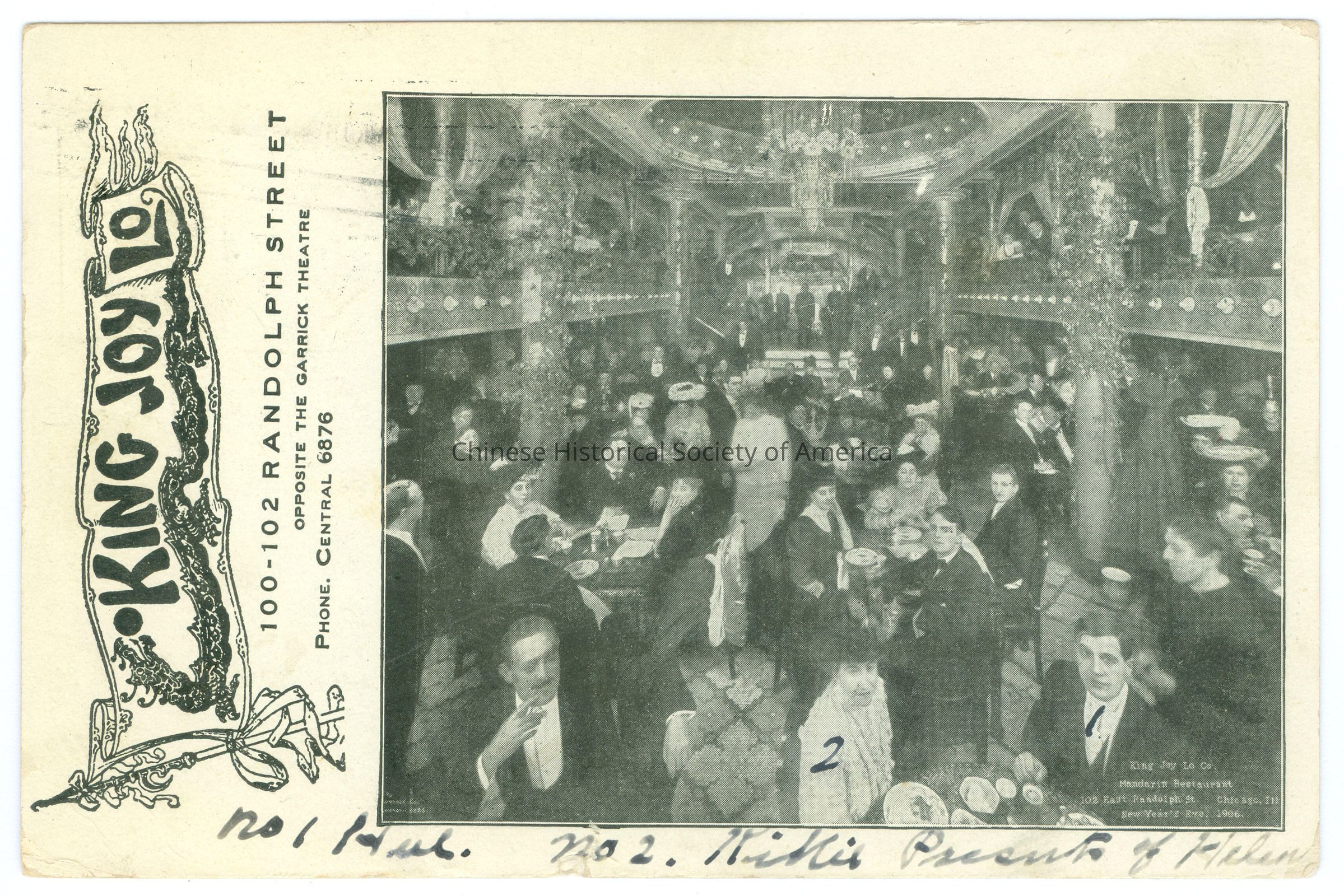 See CHSA-04704-04705. Front: Caption: "King Joy Lo, 100-102 Randolph Street Opposite The Garrick Theatre, Phone: Central 6876, King Joy Lo, Mandarin Restaurant, 102 East Randolph St., Chicago, Ill. New Year's Eve 1906." Message: Illegible. Back: Postmark: "Chicago, Ill., 7 10-00 PM" stamped in black. Stamp: a one cent green stamp with a picture of Benjamin Franklin, "Serie 1902, United States of America, 1706 Franklin 1790, Postage one cent". Message: "_"; "Mr. Hal. Cope, 2301 _, Los Angeles, Cal" handwritten. Old Accession #: DEX