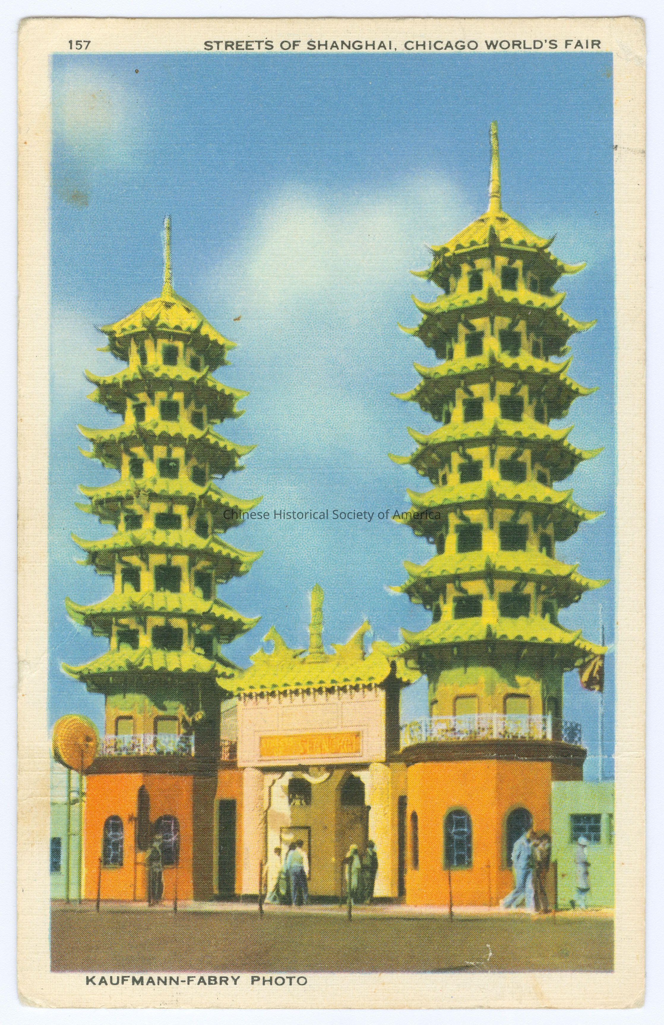 Color. Photo. Illinois; Chicago; 1933 Chicago's World Fair: There is an orange gateway and in the background are two identical tall green pagodas, there are people walking on the sidewalk and some people walking through the entrance.