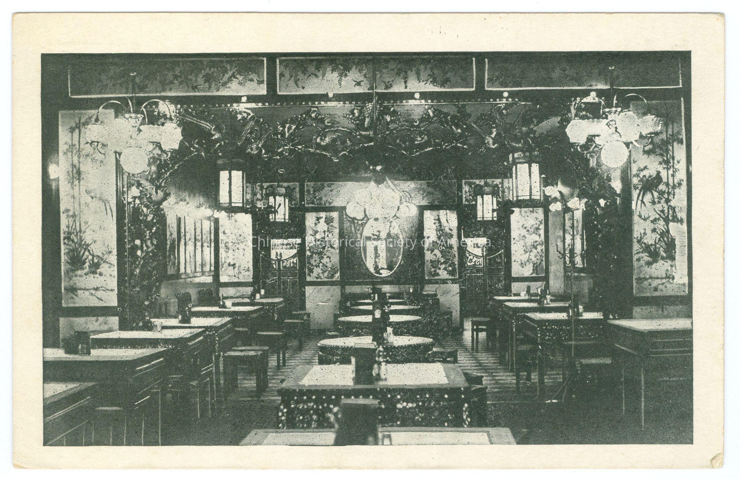 B&W. Photo. Illinois; Restaurant; The Shanghai Restaurant: Interior of a restaurant where there are 3 rows of empty tables and chairs, there are silk screens with flowers on the walls and a carved wood piece above the tables on the ceiling.