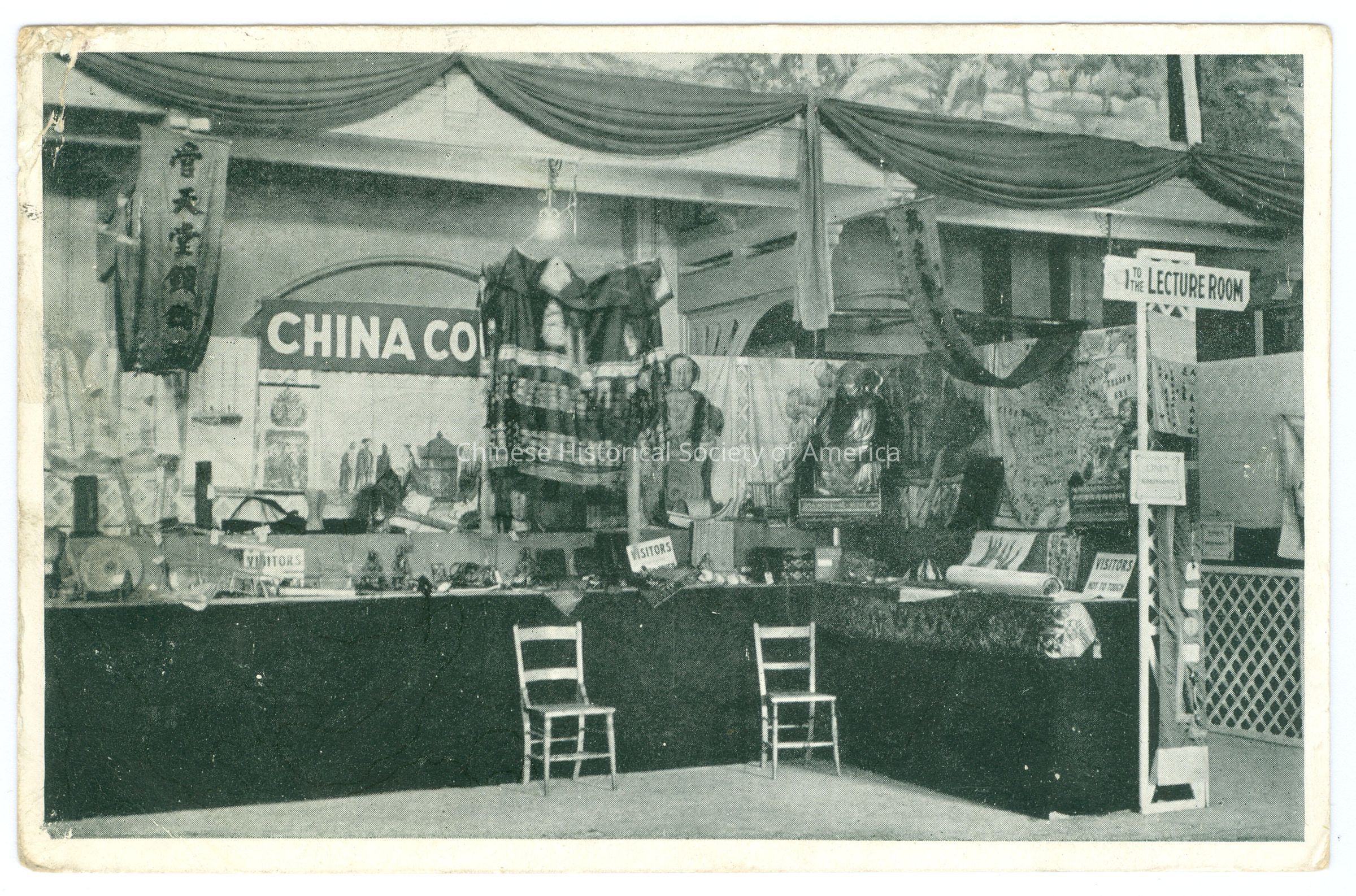 B&W. Photo. China Display: Inside view of a building where there are booths, there is a China booth with a sign "China Co", there are tables that hold Chinese signs, clothing, buddha statues, Chinese dolls, and other knick knacks.