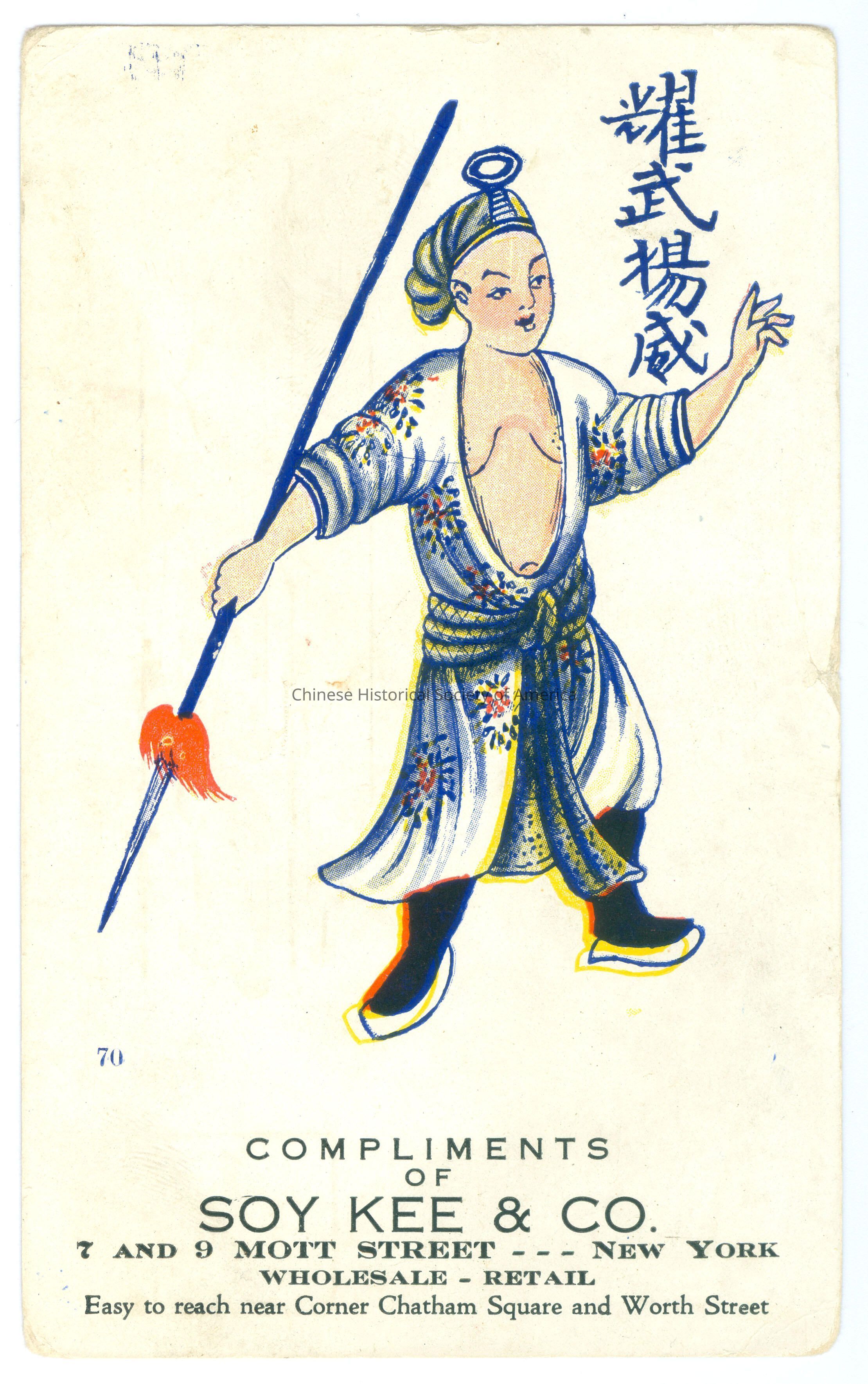 Color. Illus. New York; Ads; Soy Kee & Co.; Men: A Chinese man in a traditional blue outfit with a hat and chest showingis holding a spear with a red feather near the head of the spear.