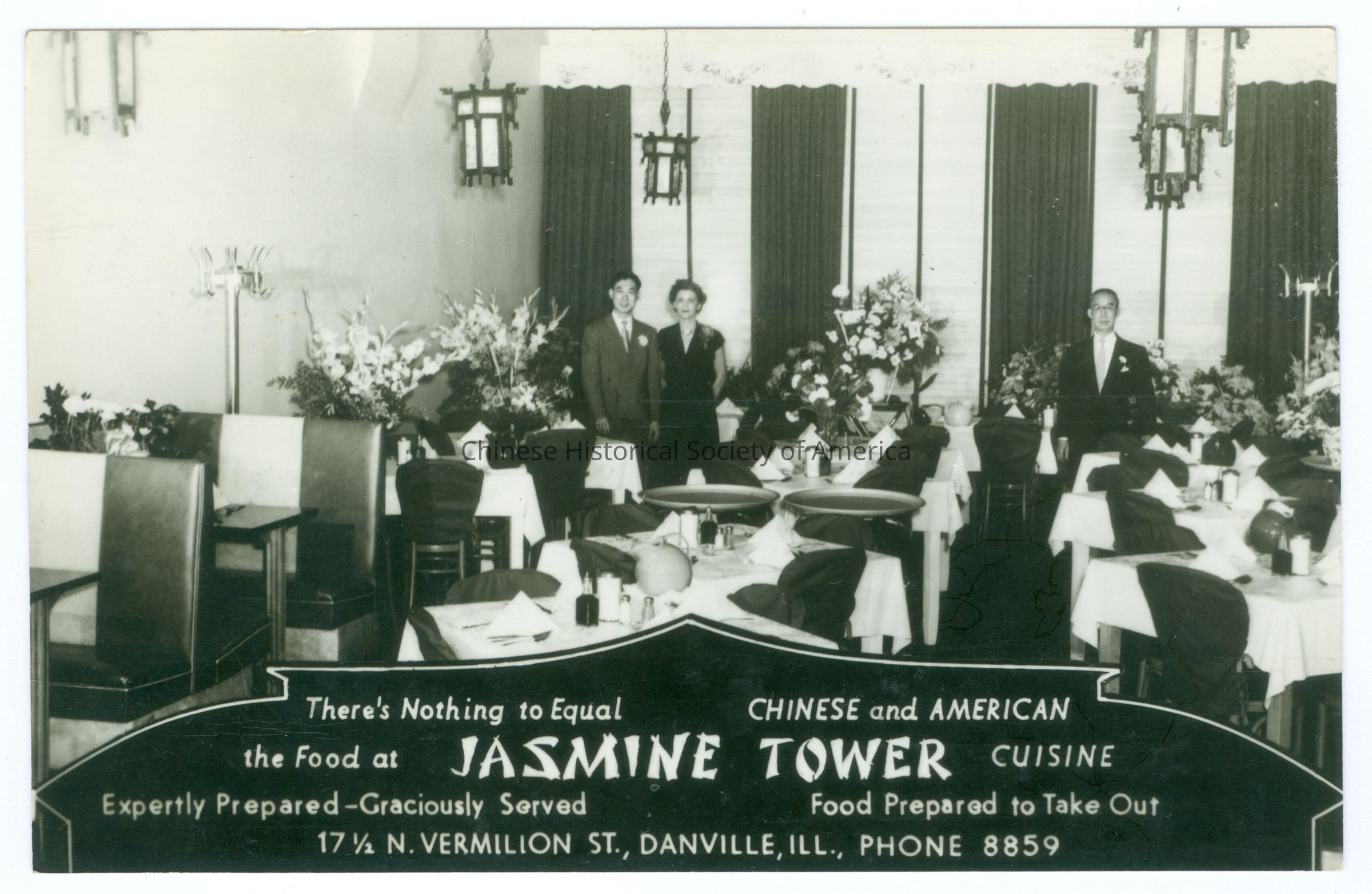 Front: Caption: "There's Nothing To Equal the Food at Jasmine Tower, Chinese and American Cuisine, Expertly Prepared-Graciously Served, Food Prepared to Take Out, 17 1/2 N. Vermillion St., Danville, Ill., Phone 8859." Back: "Genuine Photograph 'Grogranized' Danville, Ill. (Made in U.S.A.) Old Accession #: E)-