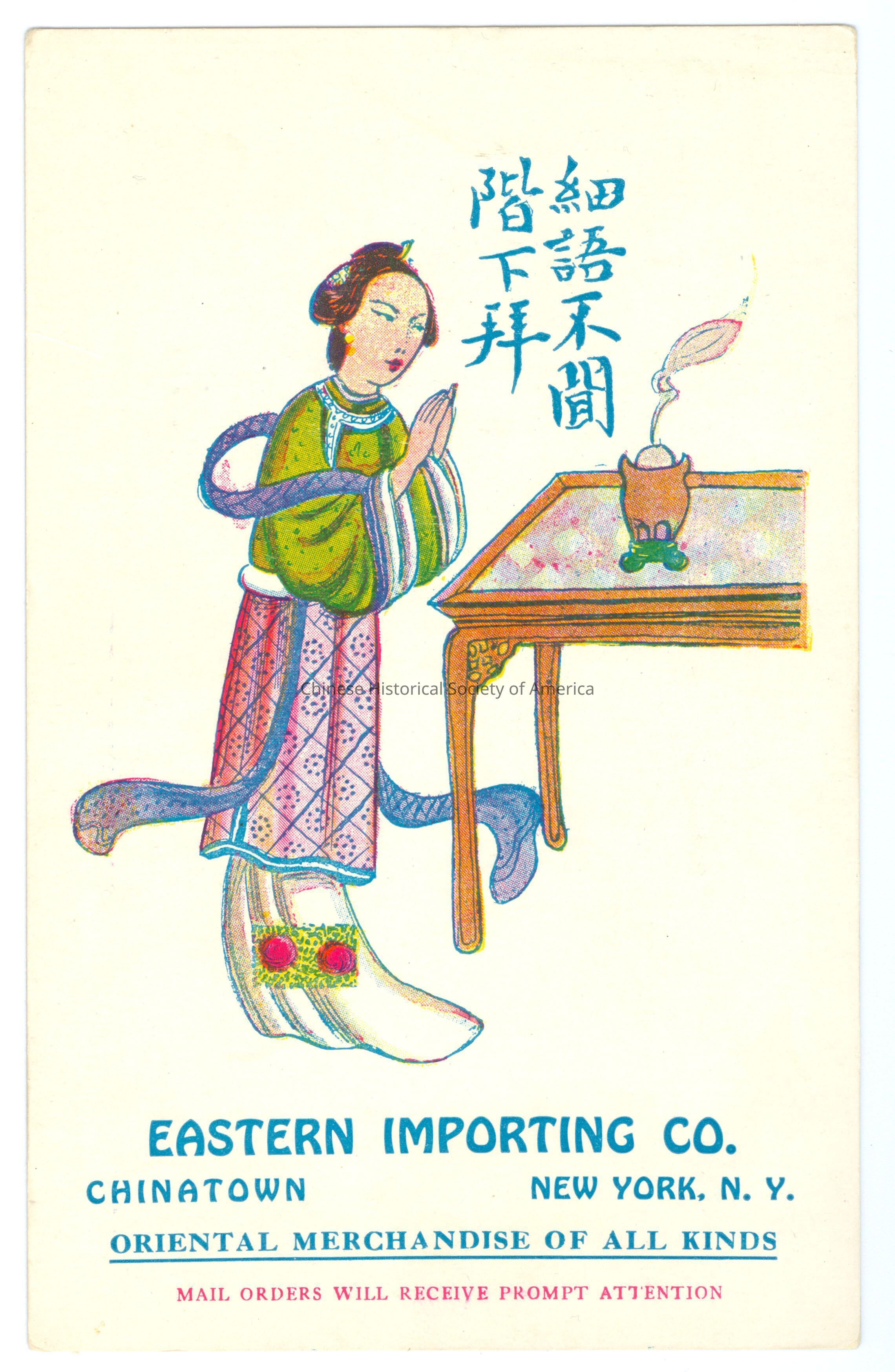 Color. Illus. New York; Ads; Eastern Importing Co.; Women: A Chinese woman in traditional green and red clothing with a purple shawl, her hands are together ready to bow to the incense burner on the table in front of her.