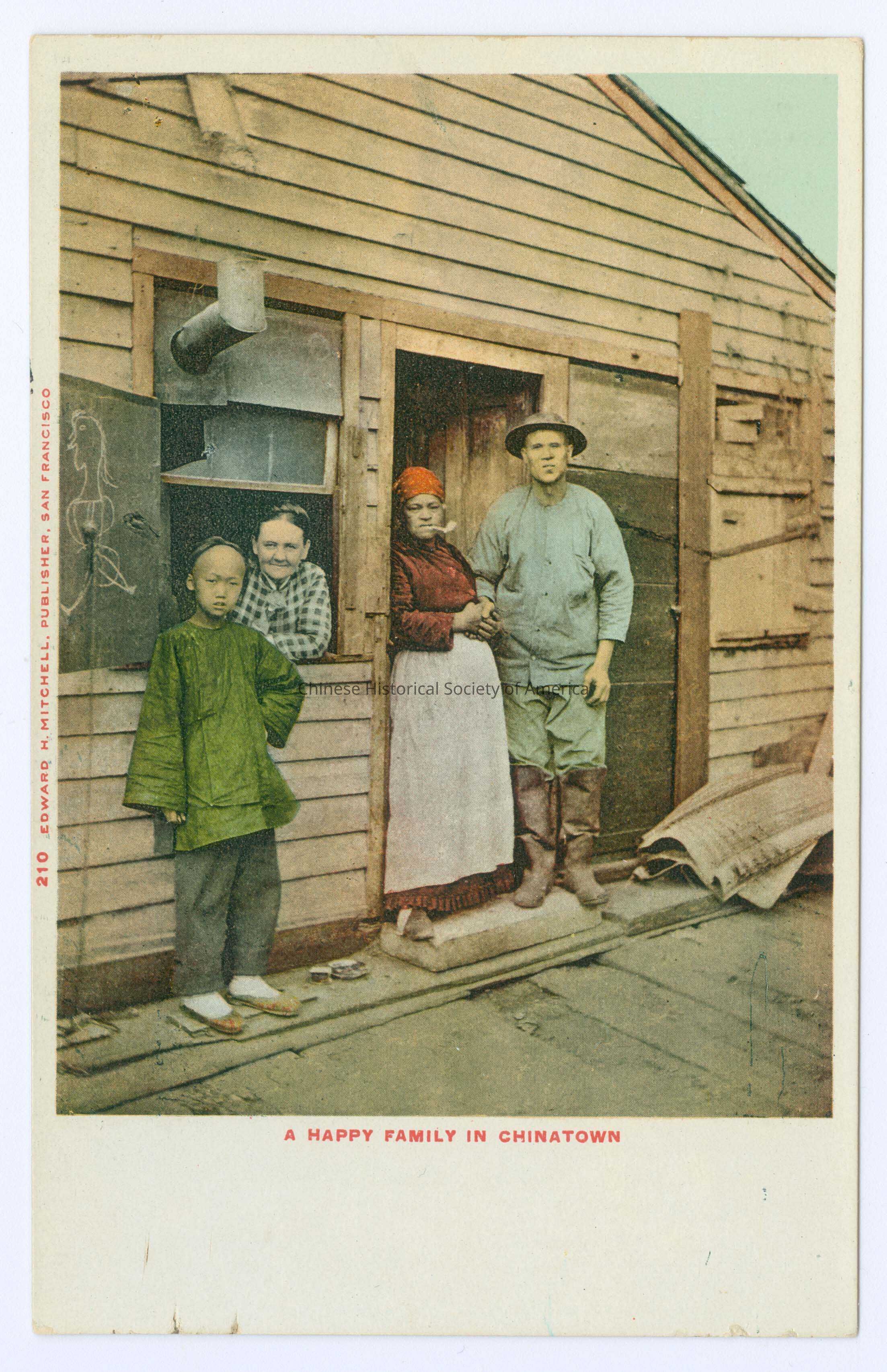 CHSA-04351 A-B. Color. Photo. SF: Family: A: A wooden house where a woman in a red bandana and shirt with white skirt is standing in the doorway smoking a pipe, next to a man in a hat with a Chinese boy in green standing in front of the window.