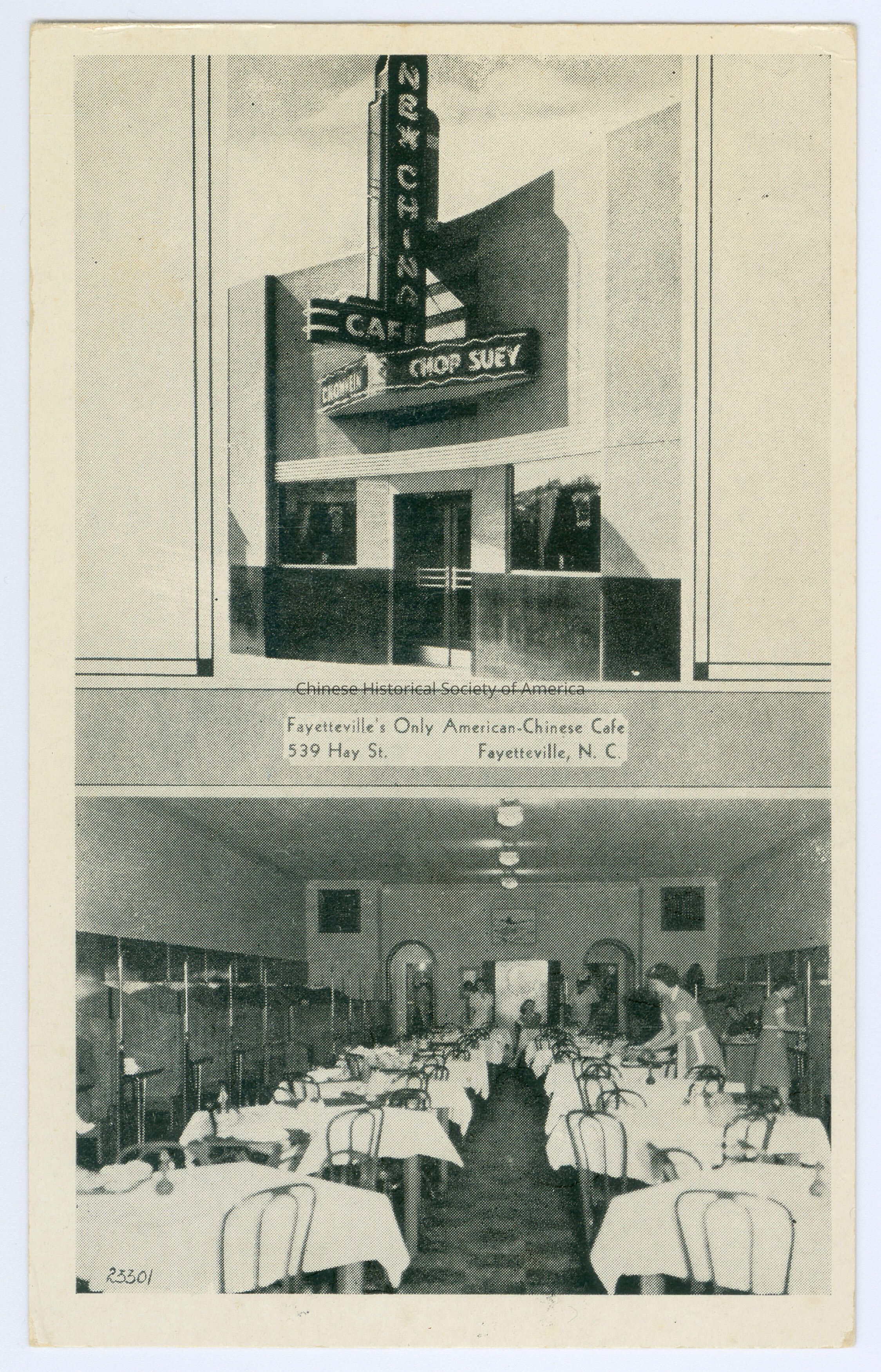 Front: Caption: "Fayetteville's Only American-Chinese Café 539 Hay St. Fayetteville, N.C." "23301." Back: Info. Text: "New China Café Chow Mein Chop Suey Steaks and Sea Food 539 Hay Street, Fayetteville, N.C." "Picto-Cards - Kaeser & Blair, Inc., Cincinatti, Ohio" Old Accession #: D)-