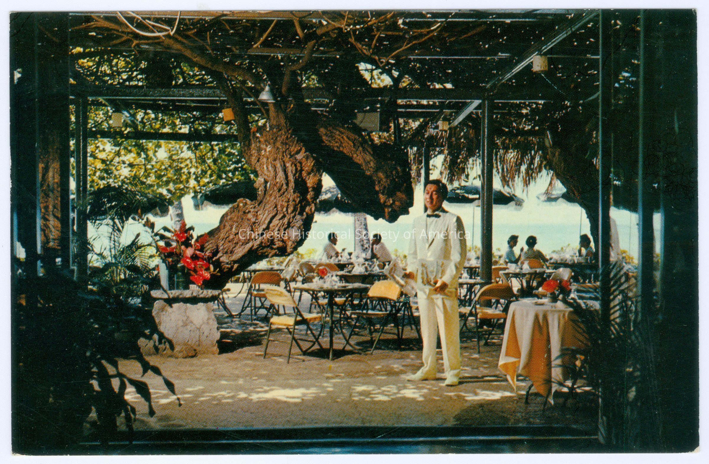 Color. Photo. Hawaii; Hotels; Halekulani: A restaurant where there is a thatched roof over tables and chairs, no walls and it faces the water, there is a waiter in a white uniform holding menus.