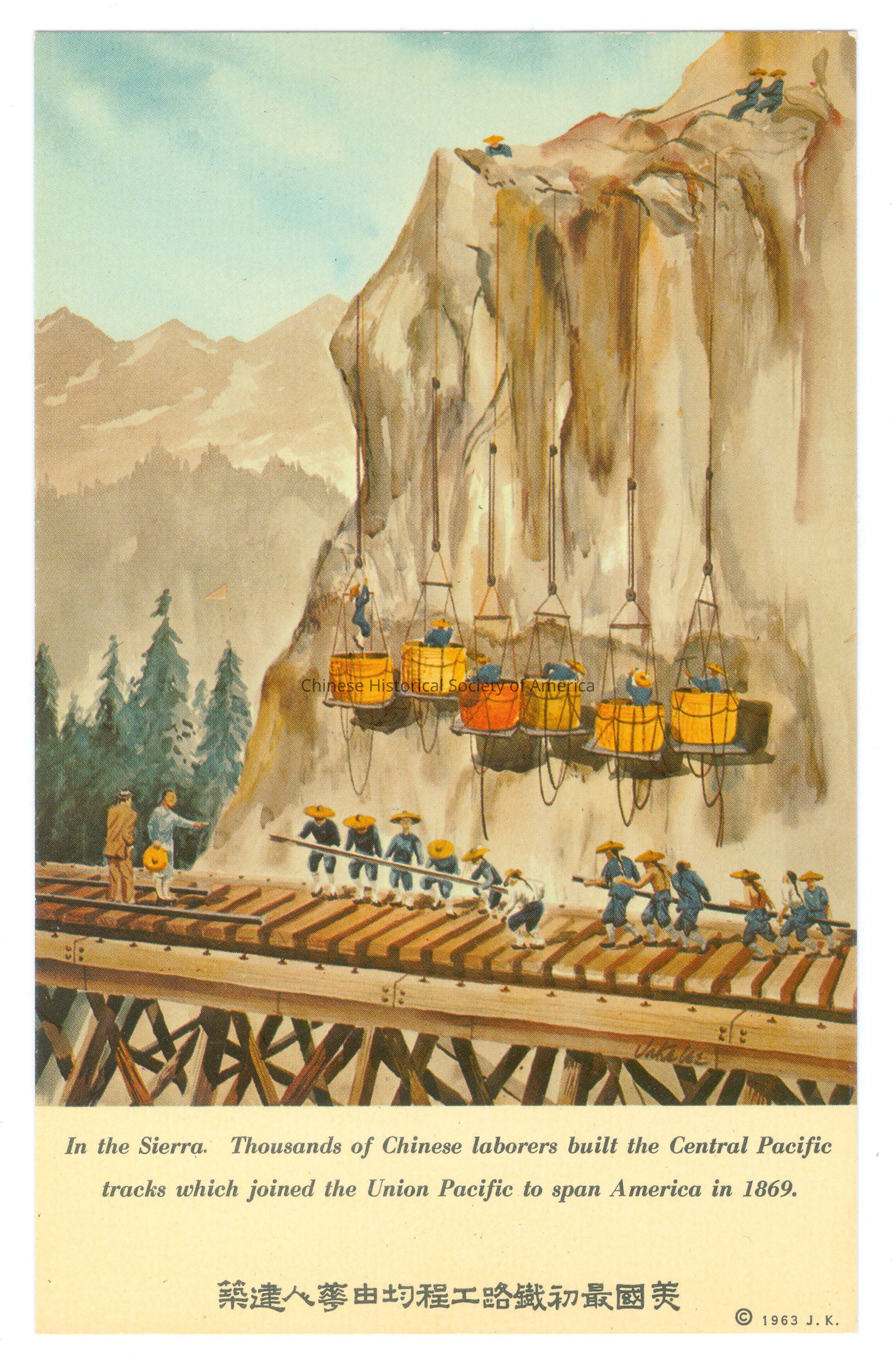 Front: There are Chinese characters on the bottom. Caption: "In the Sierra. Thousands of Chinese laborers built the Central Pacific trucks which joined the Union Pacific to span America in 1869." Back: Info. Text: "Kan's Restaurant in San Francisco, Few people realize the varied roles of the Chinese in U.S. history... how they became integral, yet distinctive part of local life. Too, few people realize the infinite variety and deliciousness of true Chinese cuisine... until theydine at Kan's, the most imitated Chinese restaurant in America."; "8th consecutive holiday award"; "Mirro-Krome, Card by H. S.Crocker Co., Inc., San Francisco 1"; "Original water color by Jake Lee copyright 1963". Old Accession #: T(XX)