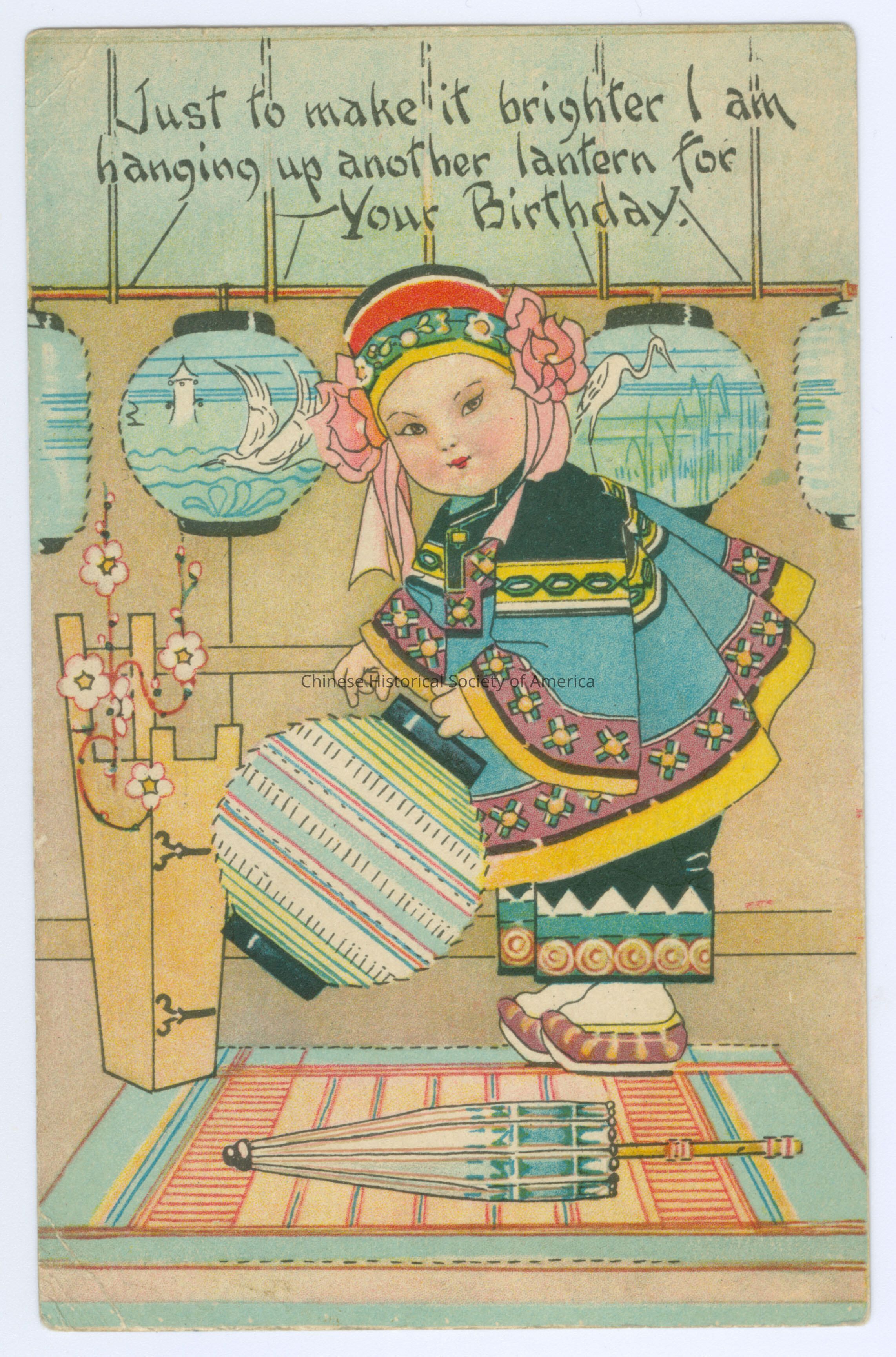 Color. Illus. Children; Greeting Cards: There are 4 paper lanterns hanging from the ceiling, a Chinese girl in traditional black and clue clothing with a green headband with pink flowers, she is holding a paper lantern and there is an umbrella at her feet.