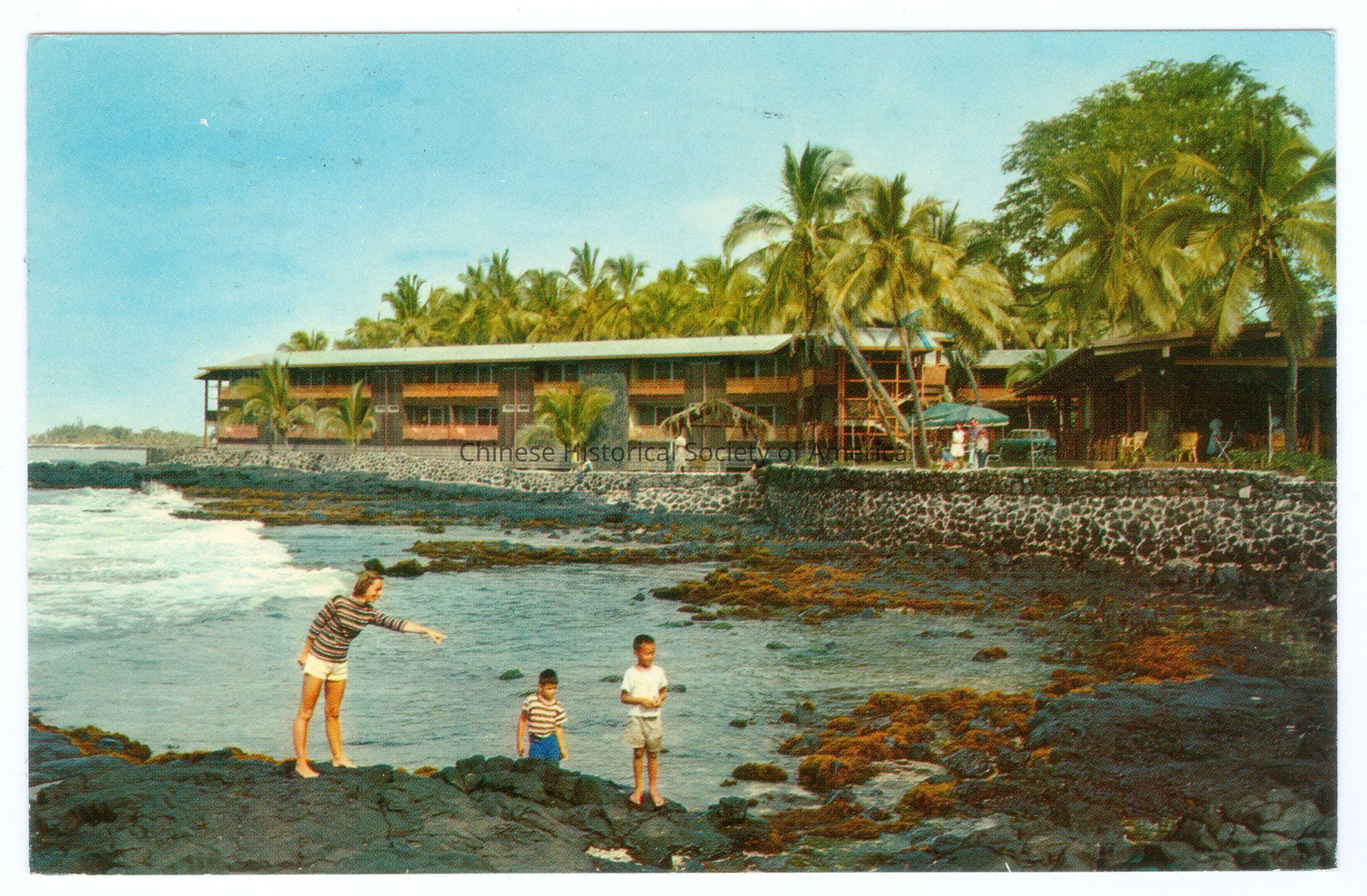 Color. Photo. Hawaii; Hotels; Waikiki Lodge: A 2 story long lodge is on a dock above the water, there is a woman and 2 boys standing on the rocks.