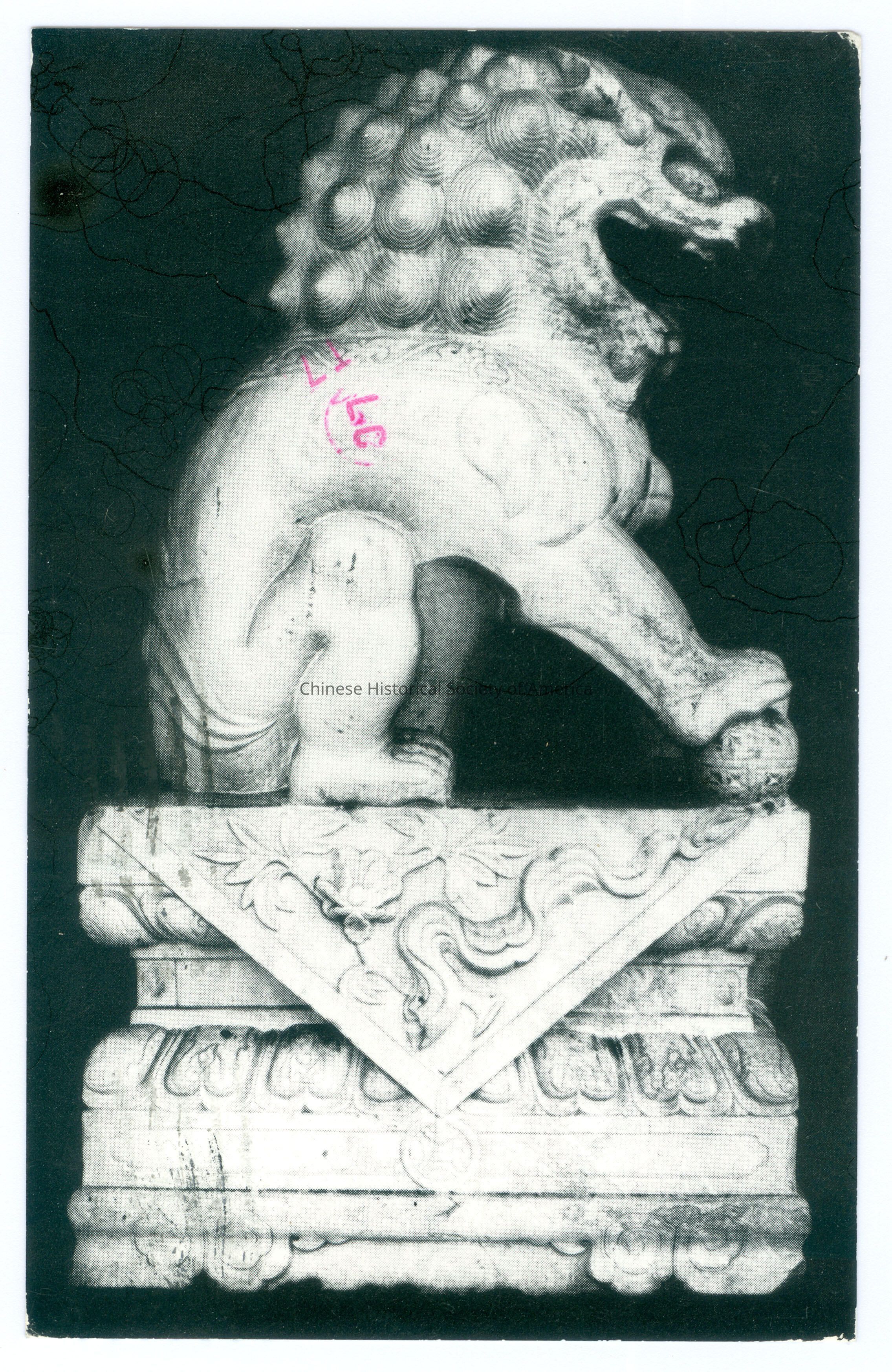 B&W. Photo. California; Pasadena; Pacificulture Asia Museum Introductory Card: Side view of a lion statue with it’s mouth open with both paws on a ball, it is on a stand.