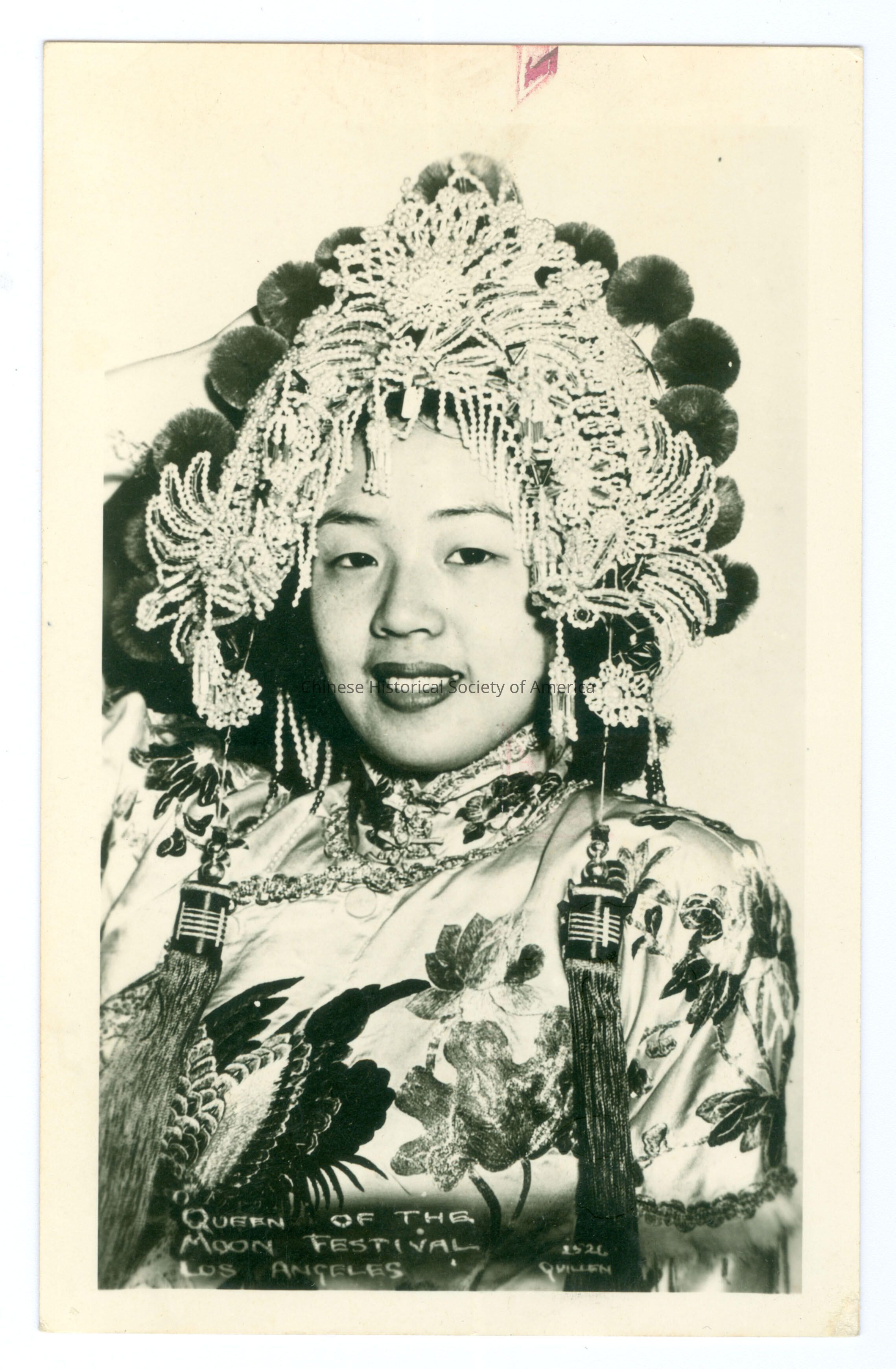 Part of a set CHSA-04515-04531. See Duplicates: Photo: CHSA-02666-02684, Negatives: CHSA-02701-02720, Slides: CHSA-02975-02993. Duplicate: CHSA-02678, Negative: CHSA-02714, Slide: CHSA-02987. Front: Caption: "Queen of the Moon Festival Los Angeles, 1926 Queen". Old Accession #: A)-