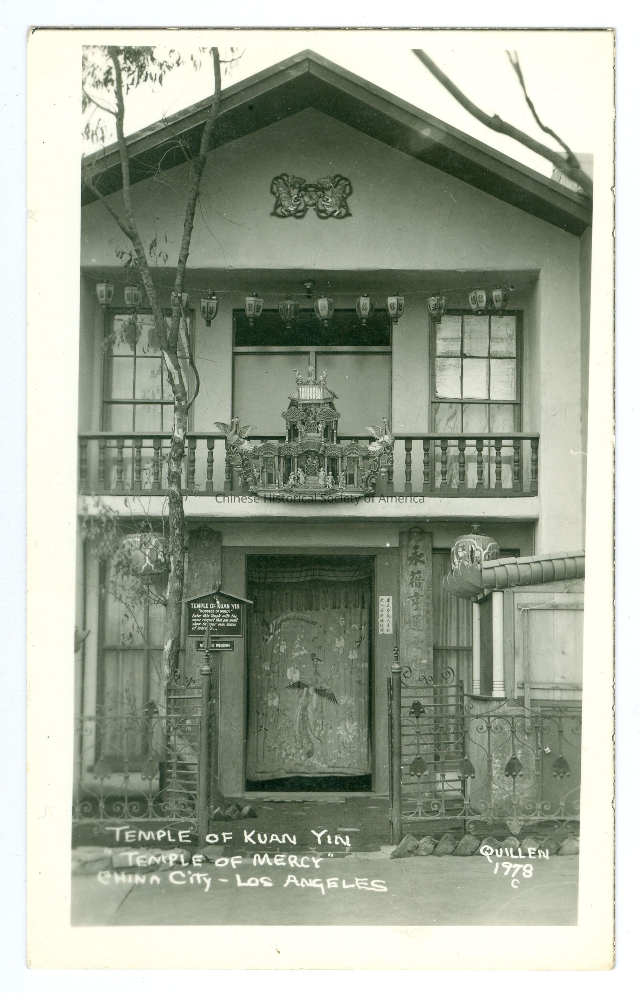 Part of a set CHSA-04515-04531. See Duplicates: Photo: CHSA-02666-02684, Negatives: CHSA-02701-02720, Slides: CHSA-02975-02993. Front: Caption: "Temple of Kuan Yin "Temple of Mervy" China City-Los Angeles." "Quillen 1978 c." Back: Old Accession #: A)-