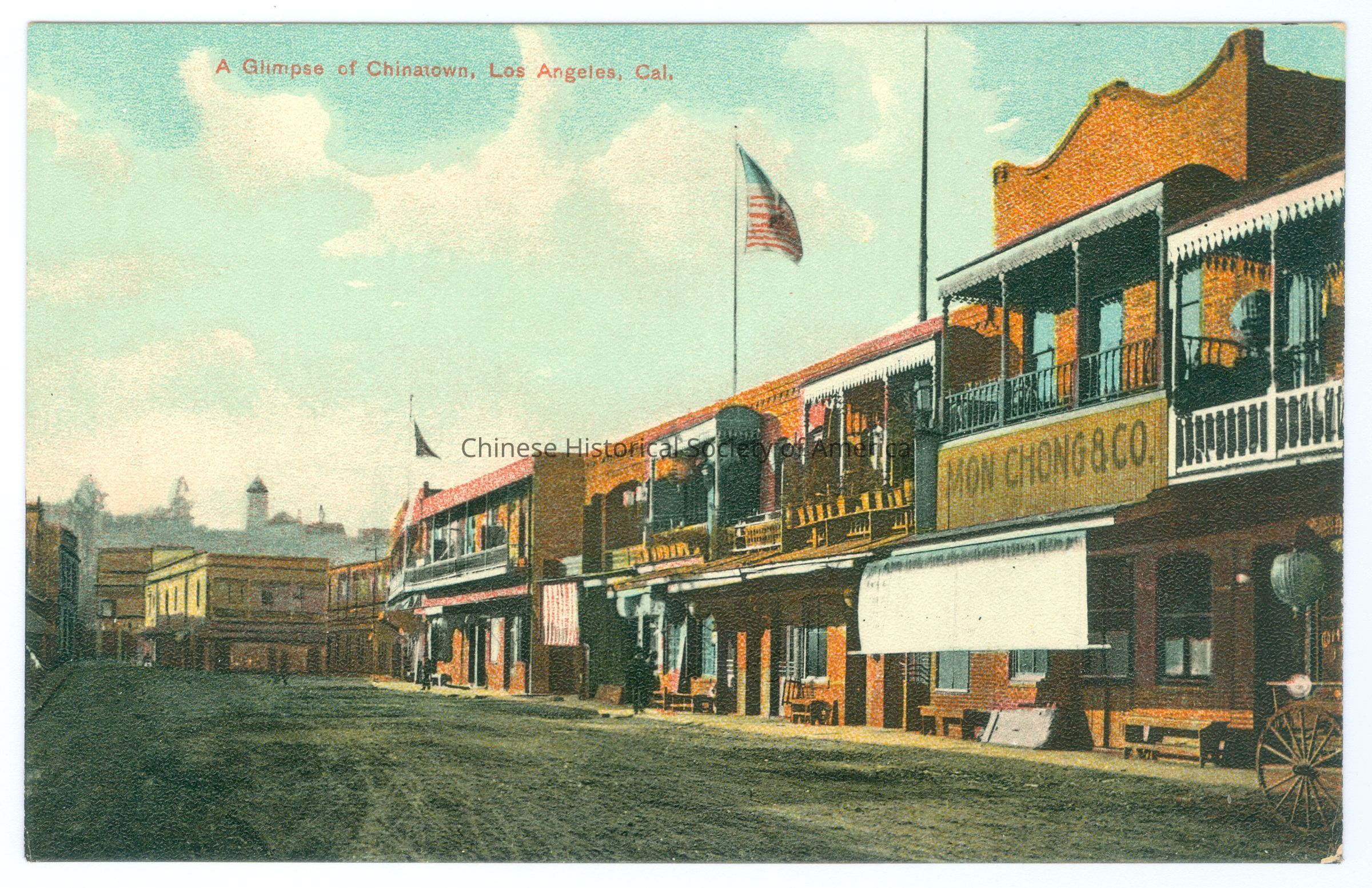 CHSA-04612 A-C. Color. Photo. California; Los Angeles; Old Chinatown Street Scene: A-C: Street scene of a row of 2 story buildings, there is a U.S. flag flying on a roof and a sign "Mon Chong & Co." hanging on one of the buildings.