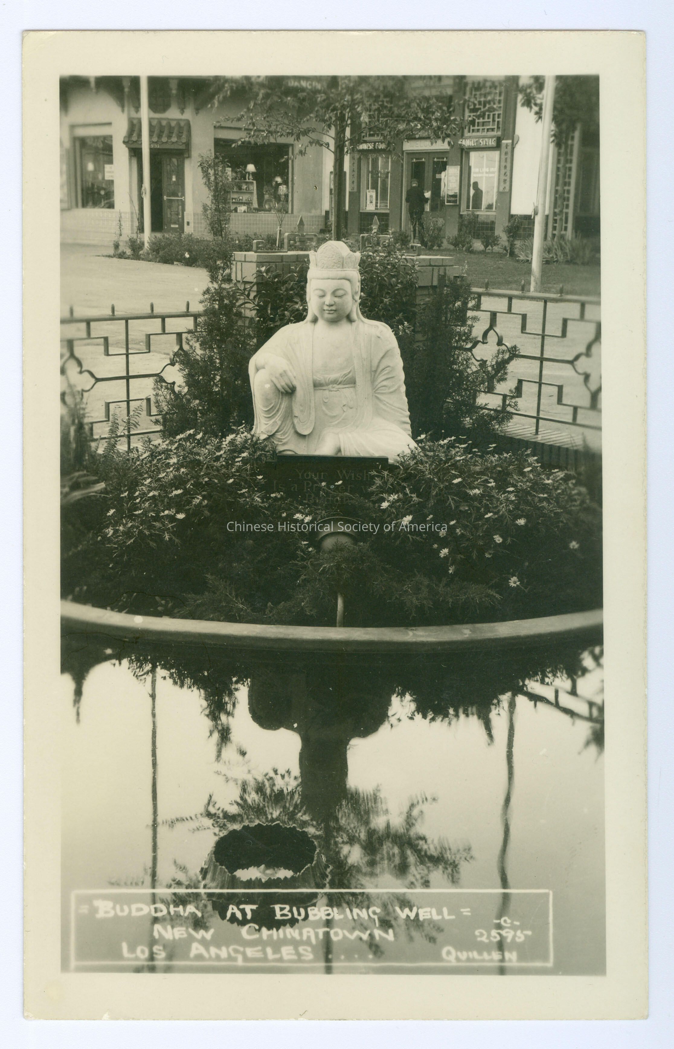 Front: Caption: "Buddha At Bubbling Well New Chinatown Los Angeles c. 2595 Quillen." Back: Old Accession #: RES
