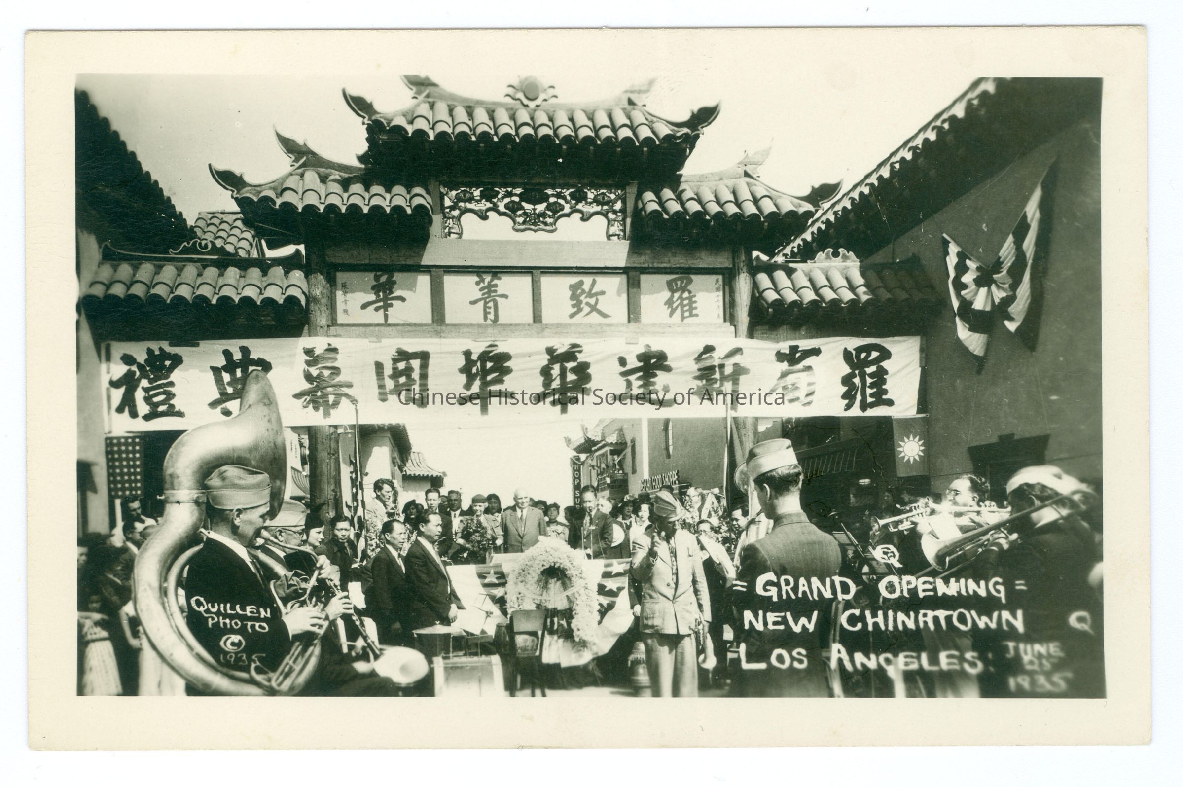 A: Front: Caption: "Grand Opening New Chinatown Los Angeles June 25 1935." "Quillen Photo c. 1935." Back: Old Accession #: N)-.