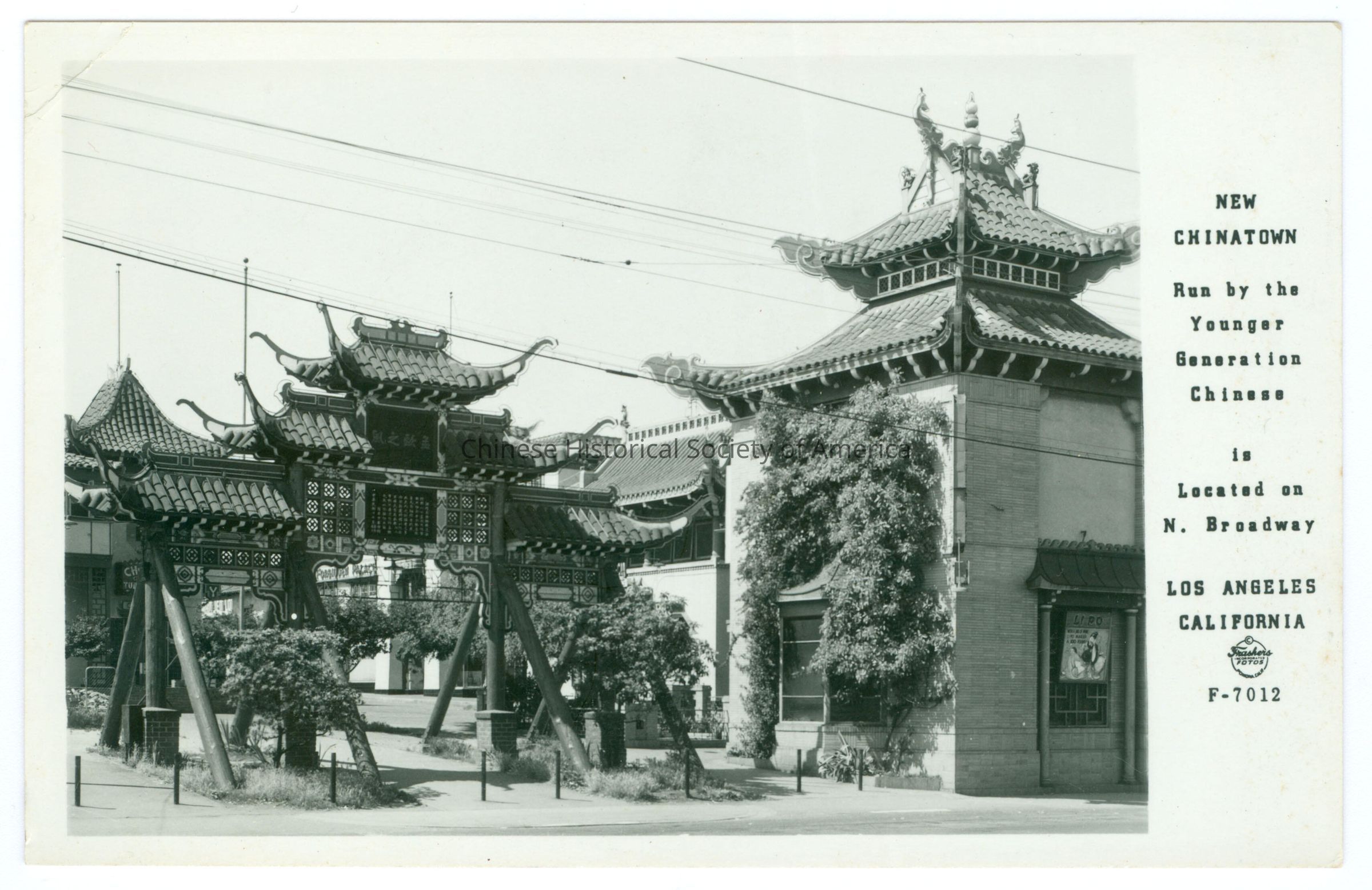 Front: Caption: "New Chinatown Run by the Younger Generation Chinese is located on N. Broadway Los Angeles California Frasher Fotos F-7012." Back: Old Accession #: AEX