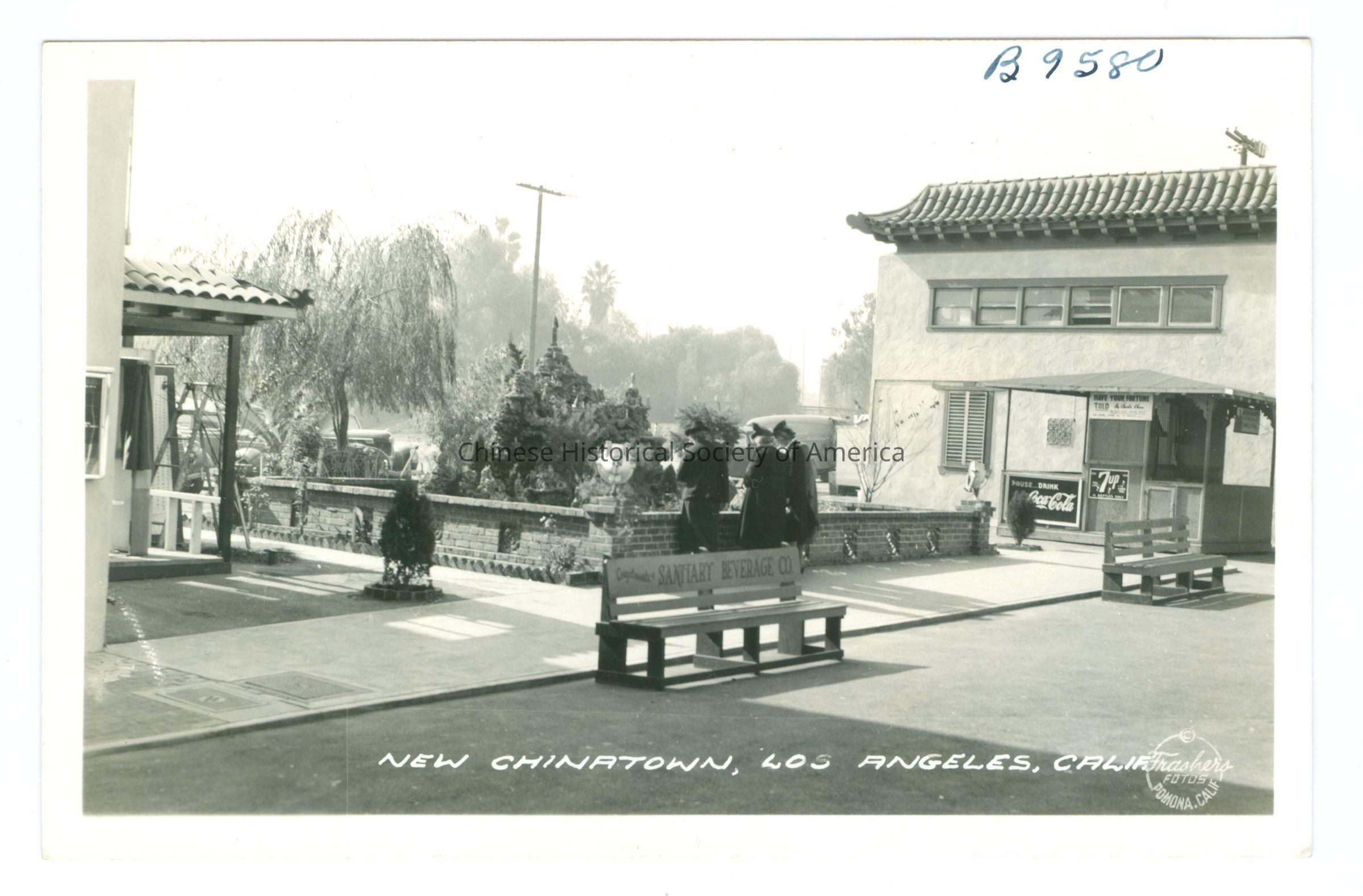 Front: Caption: "New Chinatown, Los Angeles, Calif." "Frashers Fotos Pomona Calif." "B9580", handwritten in blue. Back: "B9580", handwritten in pencil. "Pub. by Frasher's, Inc., Pomona, Calif." Old Accession #: TEX