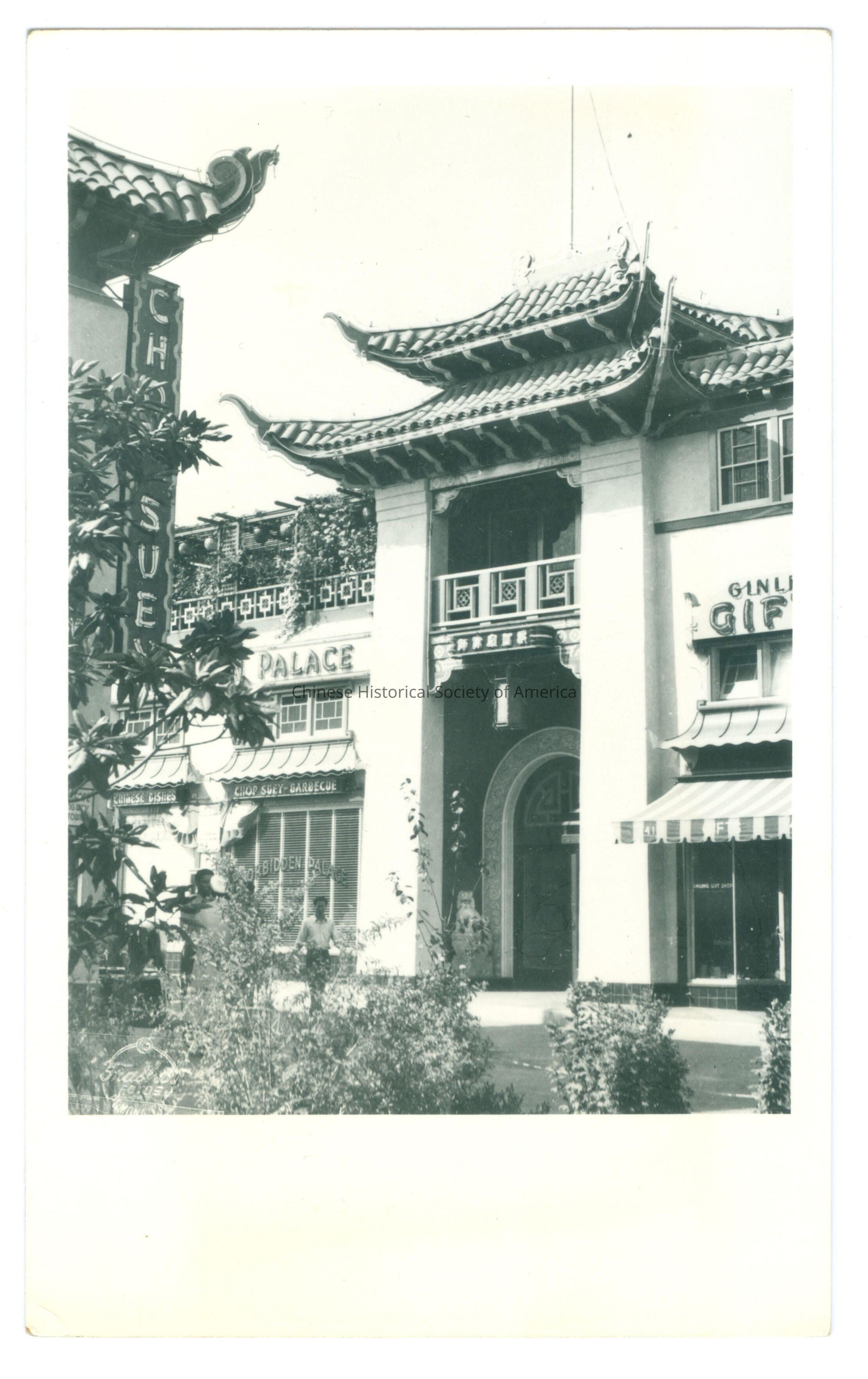 B&W. Photo. California; Los Angeles; New Chinatown Plaza: View of a 2 story building that has a 2 cruved tiled roof with a front door that a curved archway and a rooftop garden, across from it is a building with the sign "Chop Suey."