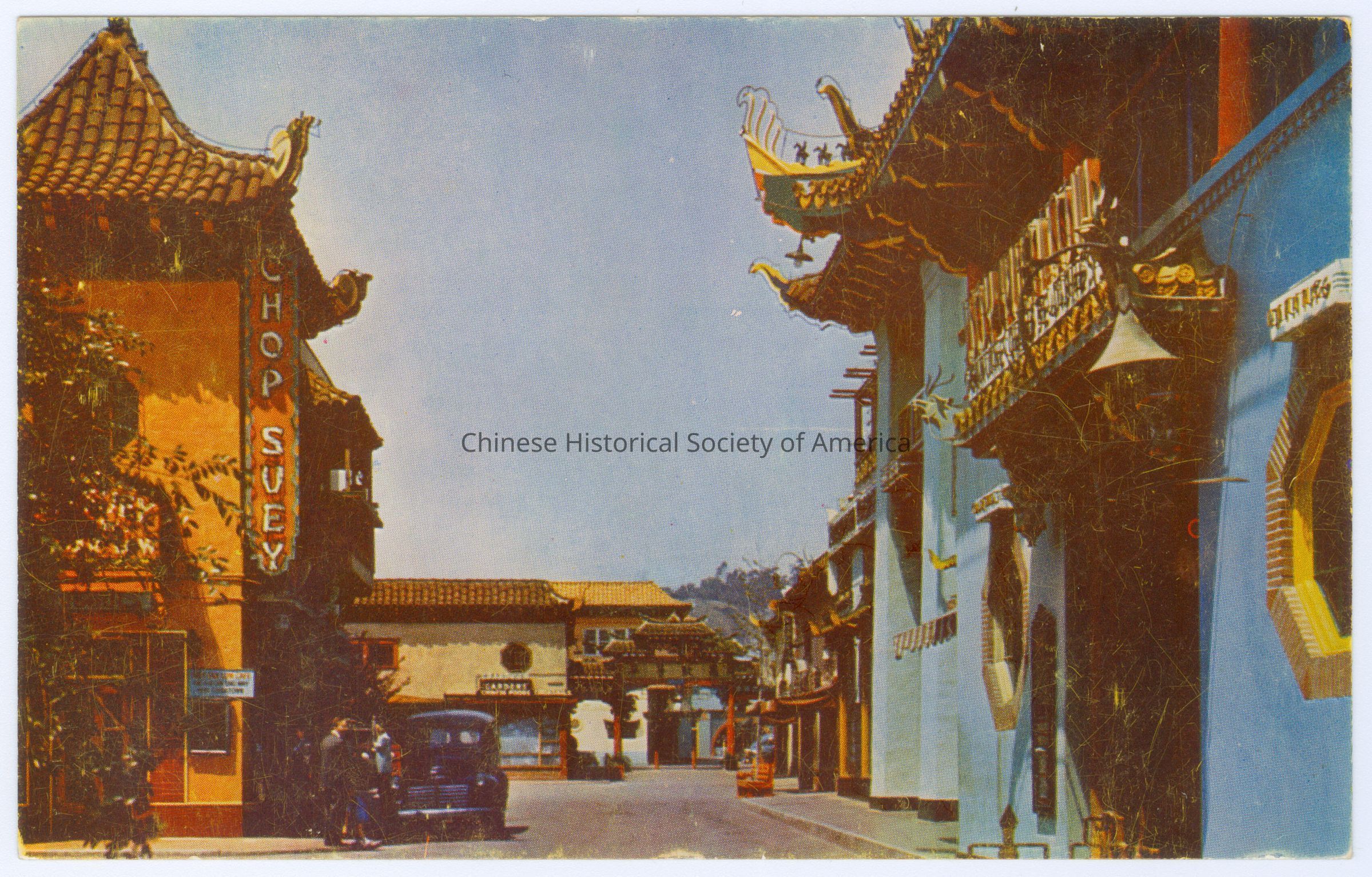 Color. Photo. California; Los Angeles; New Chinatown Plaza: Far away view of the 3 curve tiled roof gate with surrounding buildings, there is a blue building on the right with a tiled roof and on the left is an orange building with a sign "Chop Suey."