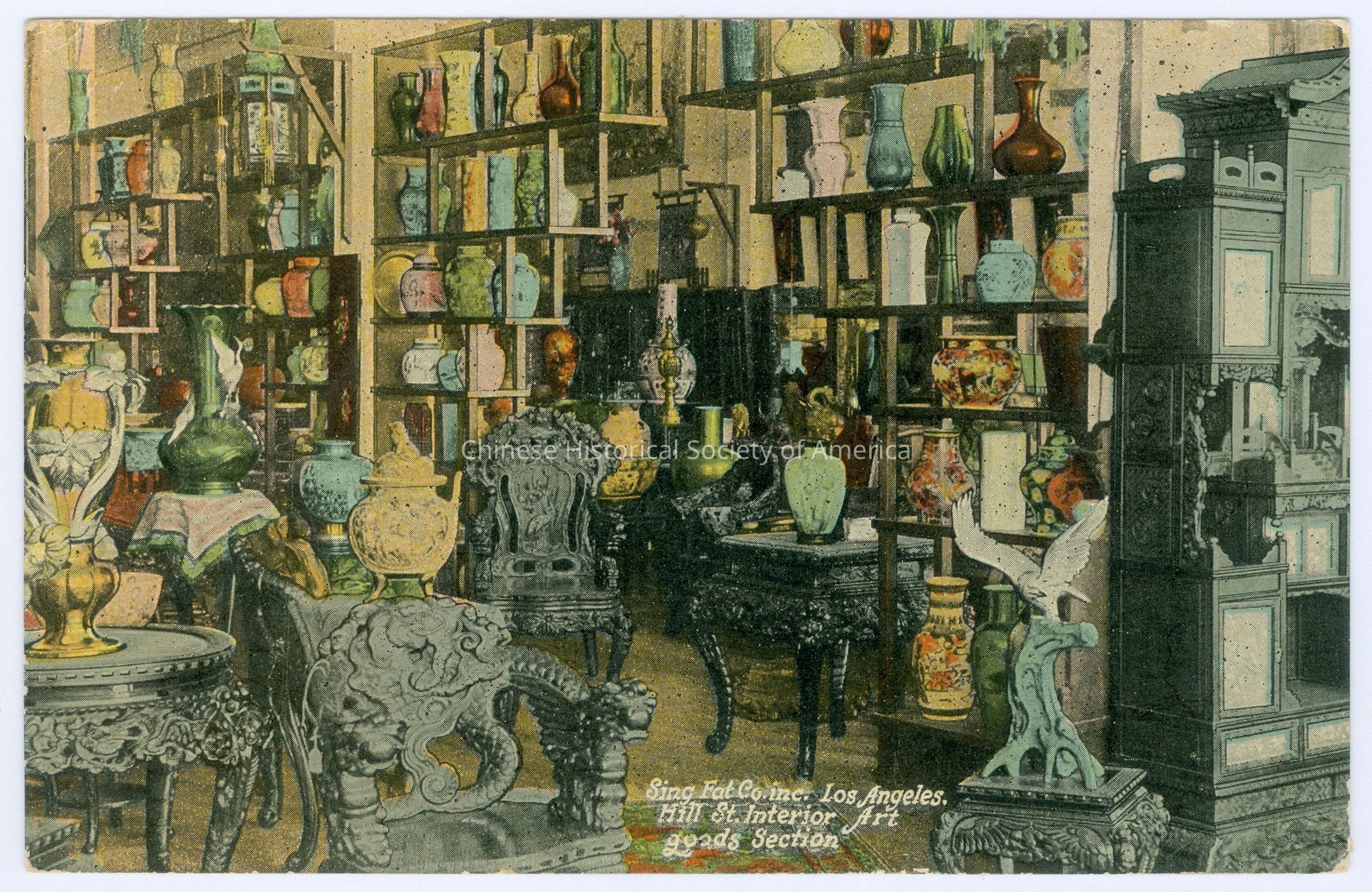 Front: Caption: "Sing Fat Co. Inc. Los Angeles. Hill St. Interior Art Goods Section." Back: Info. Text: "Sing Fat Co., Inc. Oriental Emporium, 613-615 So. Broadway, 614-616 So. Hill St. Los Angeles, Cal." Address: "Mrs C C Page Los Angeles Calif. B