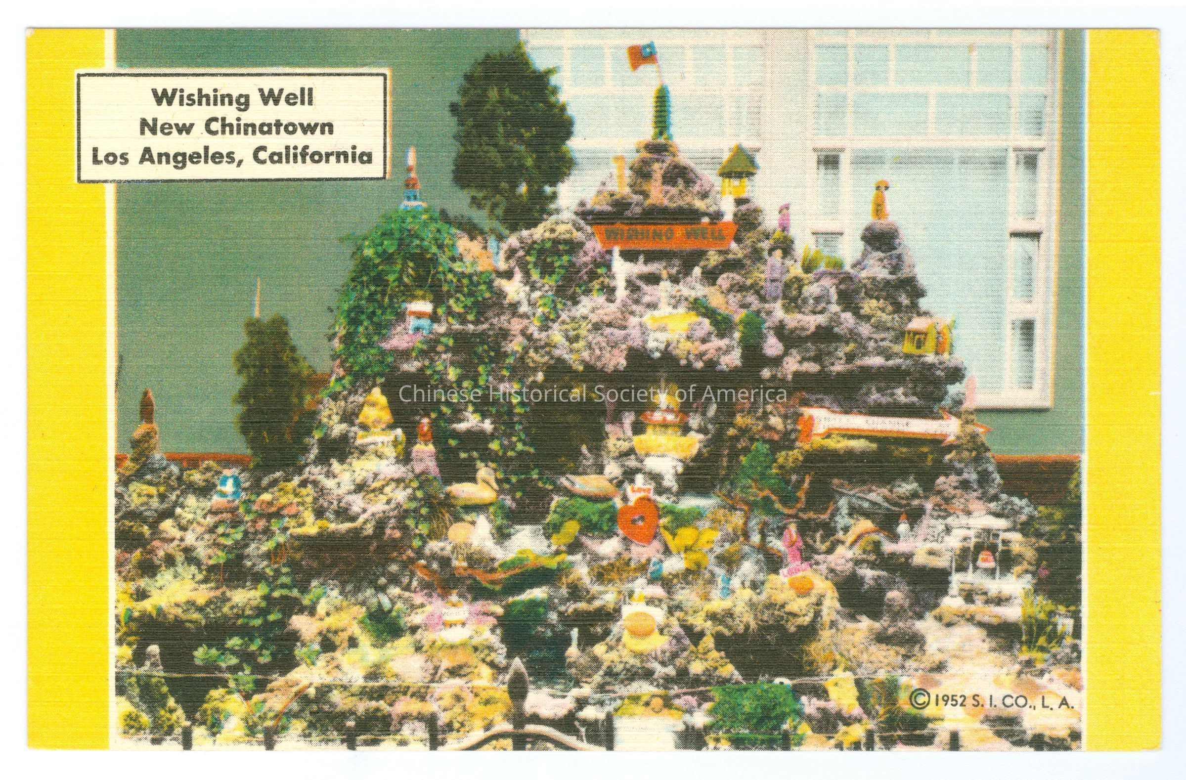 Front: Caption: "Wishing Well New Chinatown Los Angeles, California." Back: Info. Text: "In a setting of Old China, with shrines, lily pools, and courts, the Chinese have gathered the art treasures of the Orient. Here is offered silks, antiques, jewelry, and thousands of beautiful souvenirs. The delicacies prepared in the fine Chinese restaurants are fit for a Mandarin, and delight the palate as well as the eye" "Pub. by S. L. Co., Los Angeles, California." Old Accession #: PAE