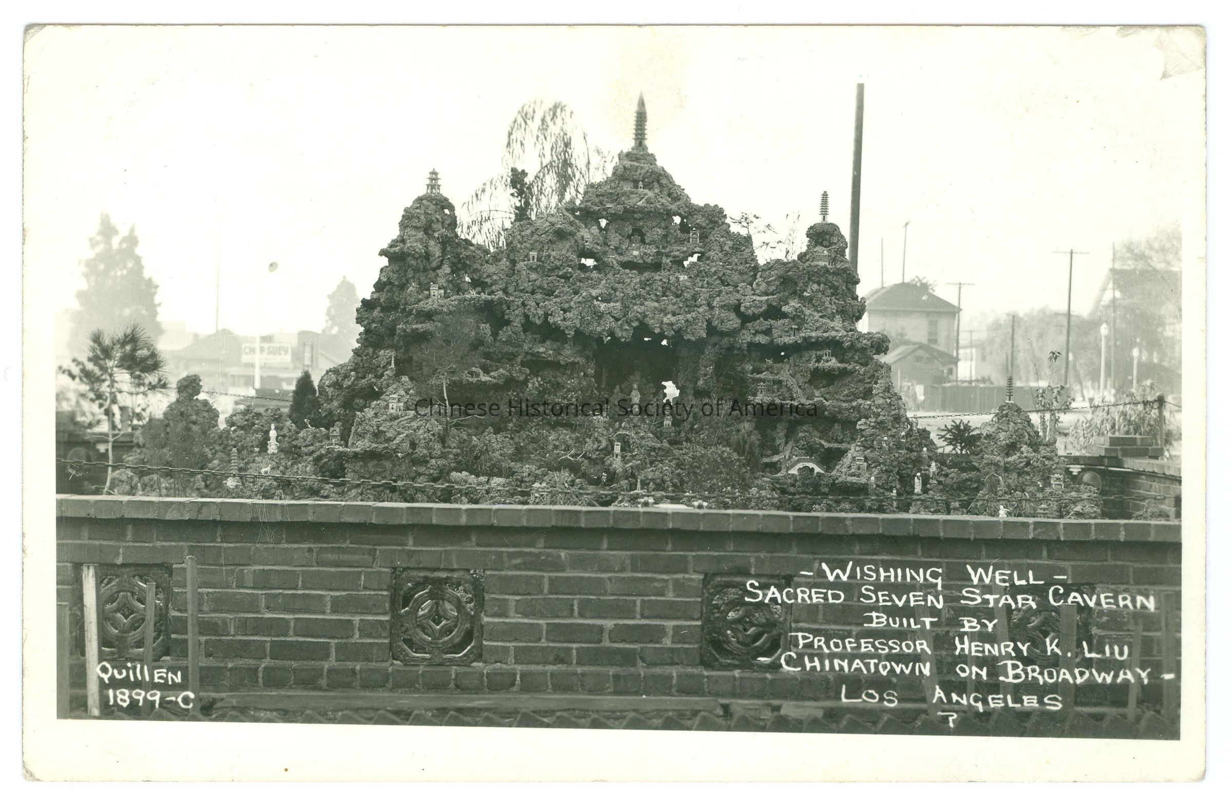 Front: Caption: "Wishing Well Sacred Seven Star Cavern Built By Professor Henry K. Liu Chinatown on Broadway Los Angeles 7." "Quillen 1899-C." Back: "Julie", handwritten in pencil. Old Accession #: TL)-