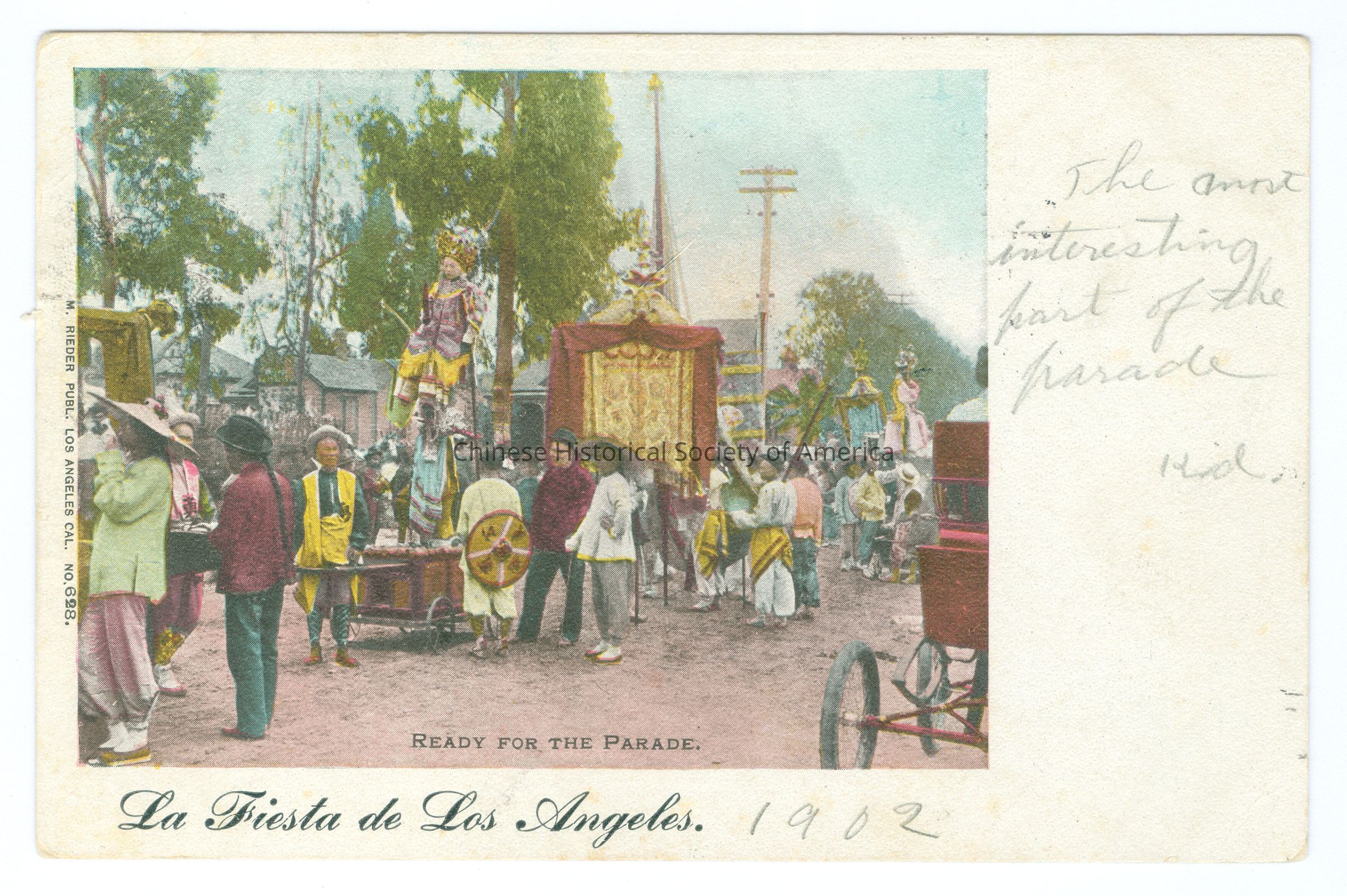 A: Front: Caption: "Ready For The Parade"; "La Fiesta de Los Angeles." Message: "The most interesting part of the parade RD. 1902", handwritten in pencil. "M. Reider Publ. Los Angeles Cal. No. 628." Back: Postmark: "Los Angeles, Cal. May 6 1903 1