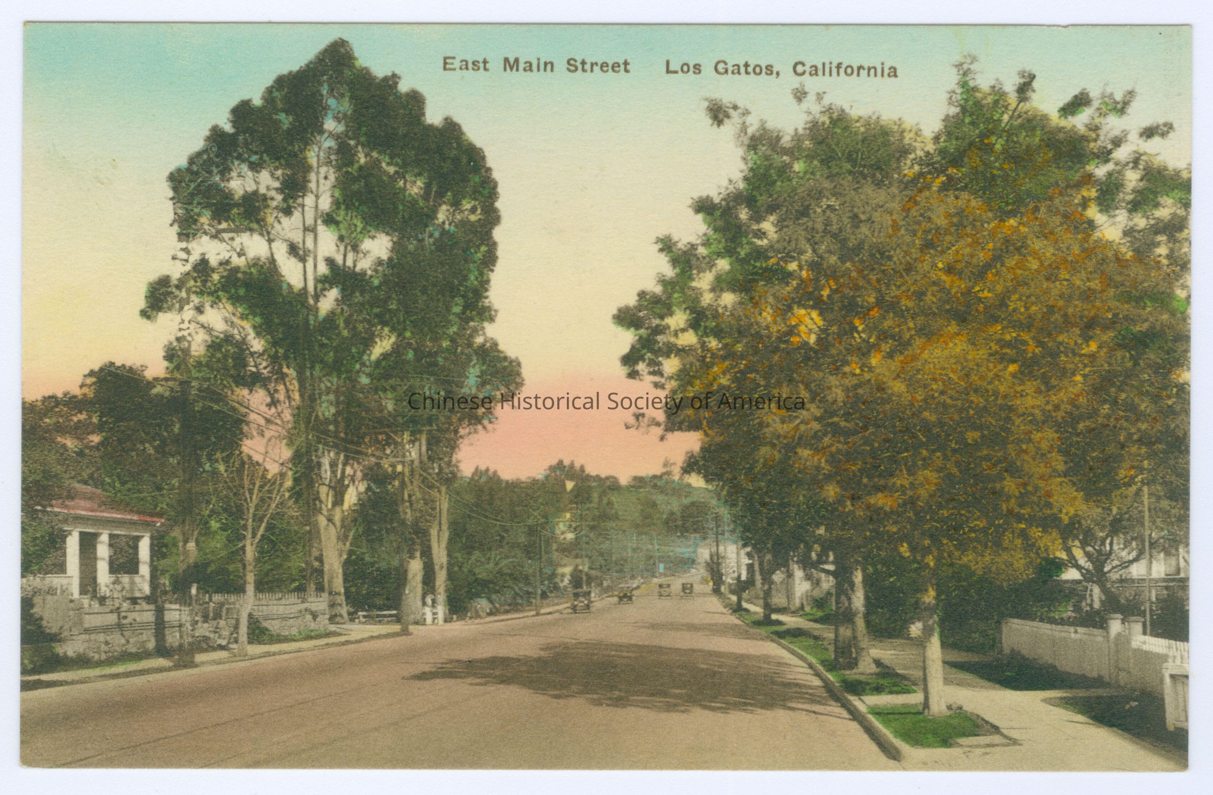 Front: Caption: "East Main Street, Los Gatos, California." Back: "Post Cards of Quality.-The Albertype Co., Brooklyn, N.Y." Old Accession #: /DE