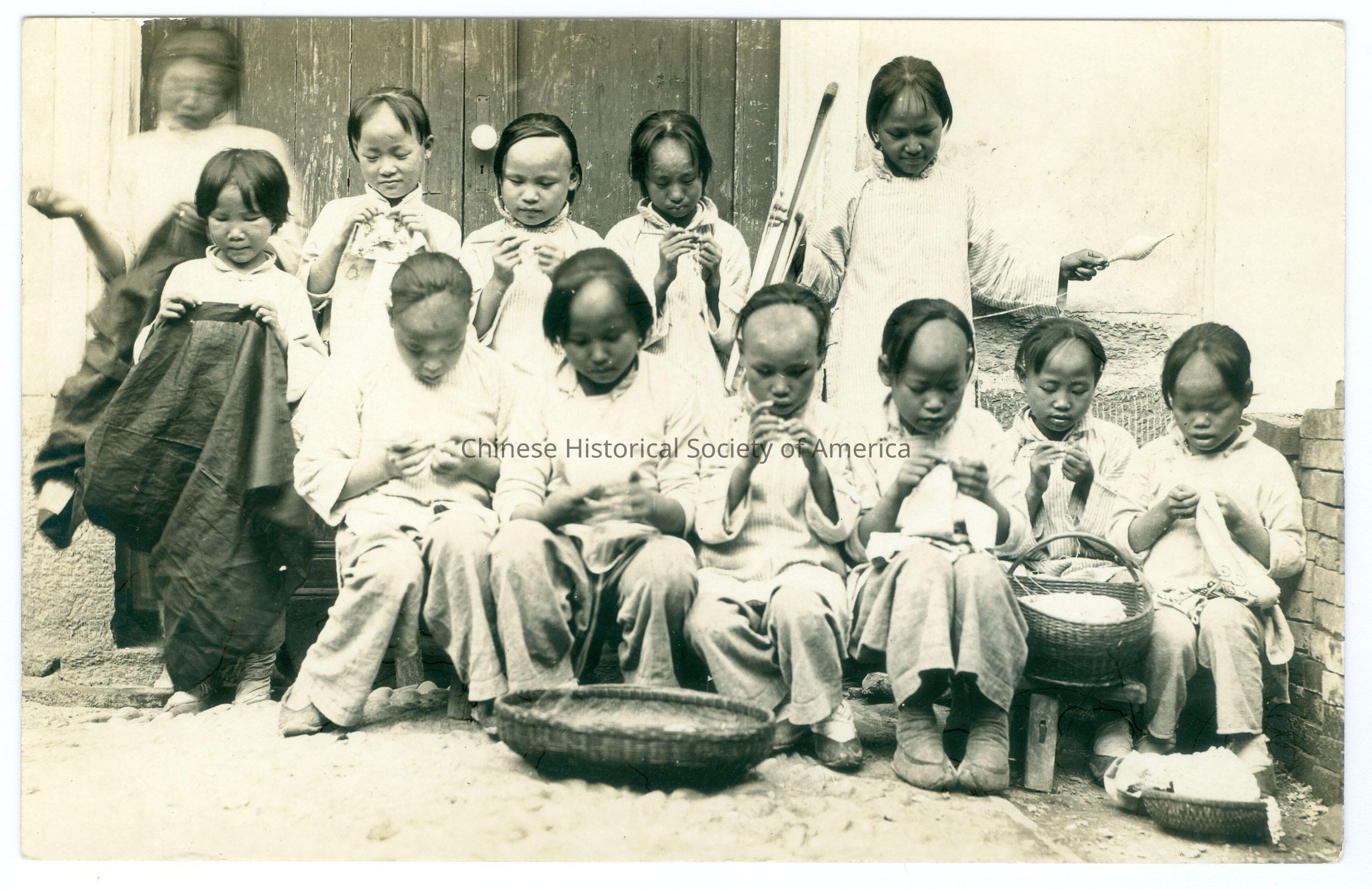 B&W. Photo. Children: A group of Chinese boys, they are sitting outside in 2 rows sewing or threading a needle, there is a basket in front of them.