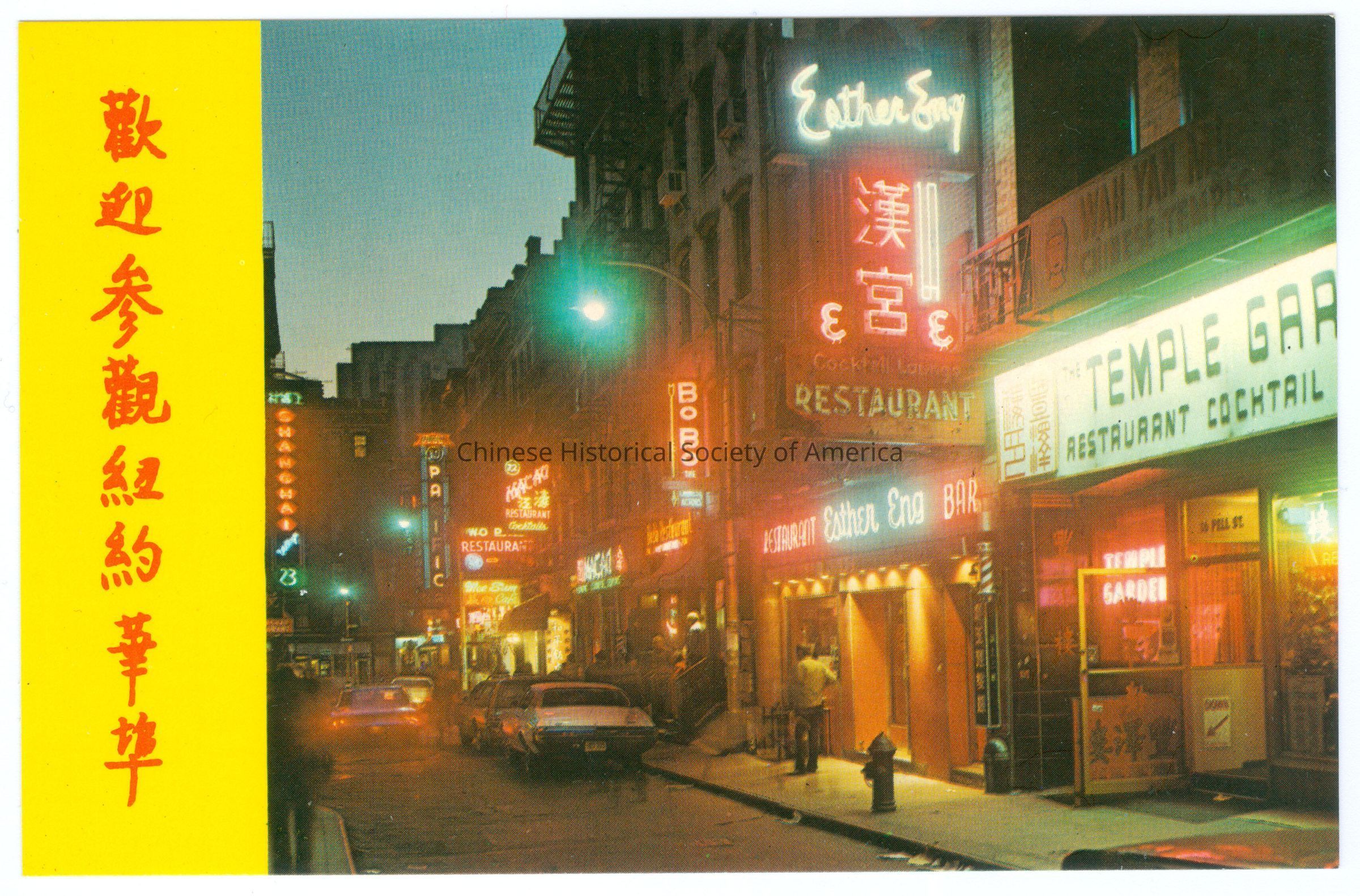 CHSA-04757 A-B. Color. Photo. New York; Chinatown; Pell St.: A-B: A night scene of a side of a street with the buildings that have sign lit up, some signs are "Wsther Eng Restaurant," "Temple Garden."