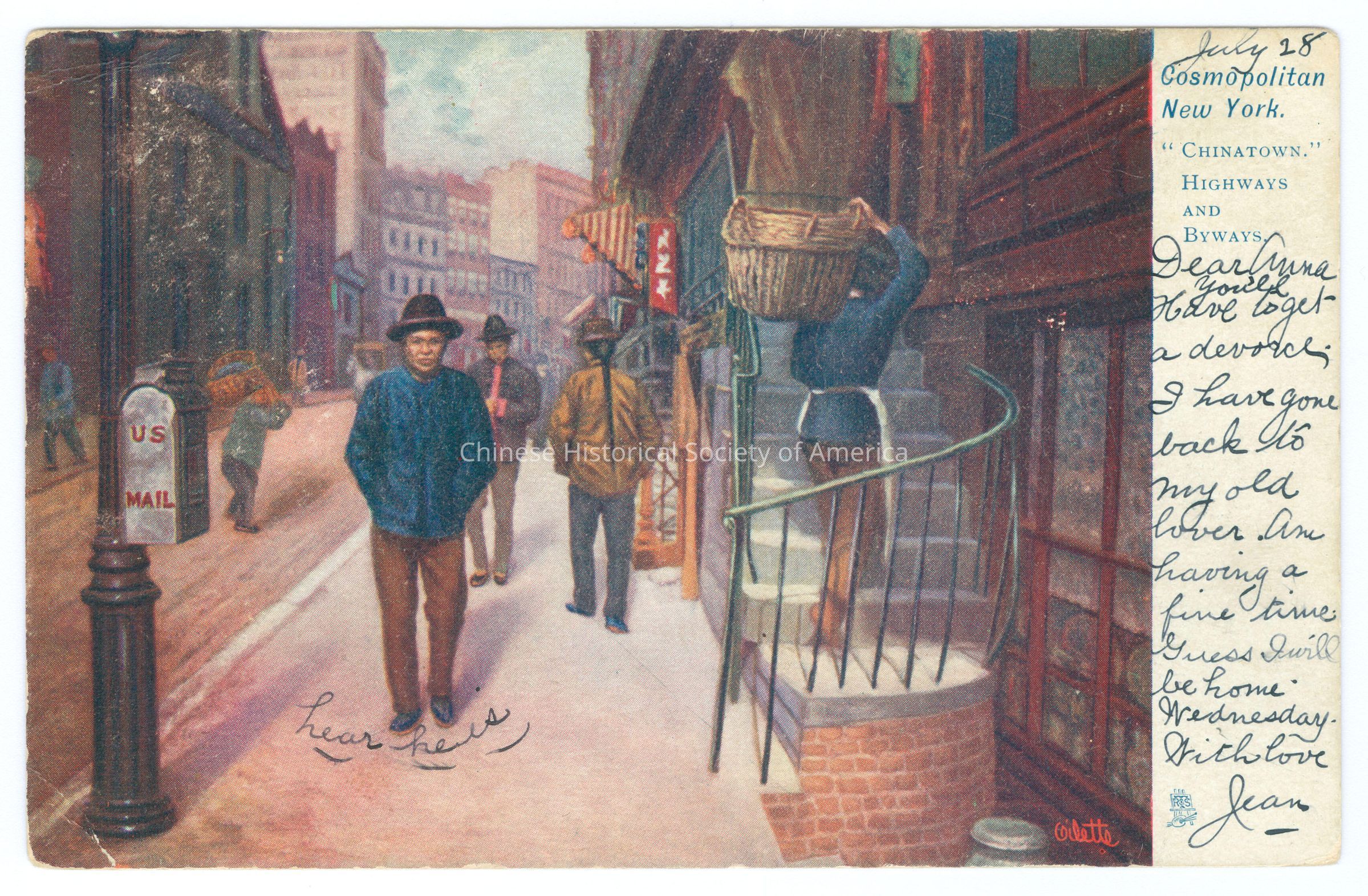 Cosmopolitan New York Series: CHSA-04758-04763. A: Front: Caption: "Cosmopolitan New York, "Chinatown Highways and Byways"." Message: "July 28 Dear Anna you'll have to get a divorce. I have gone back to my old lover. Am having a fine time. Guess I will be home Wednesday. With love, Jean." Back: Info. Text: "Highways and Byways. Some thirty "companies" of Chinese merchants do business in the highways and byways of the streets of Chinatown, a number of whom supply Chinese shops in outlying towns. Their stocks are mainly imported direct, and include a wide range of goods."; "Cosmopolitan New York. Raphael Tuck & Sons' "Oilette" [Regd.] Postcard 1068. Art Publishers to their majesties the King & Queen." Postmark: Jersey City, N.J., Jul 29 1906, 12 - M" stamped in black. Stamp: a one cent green stamp with a picture of Benjamin Franklin, "Series 1902, United States of America, 1706 Franklin 1790, Postage one cent". Message: "Miss Anna Hector, 133 E. 16th St. N.Y. City. To D. D. P. + Co" Old Accession #: A)-