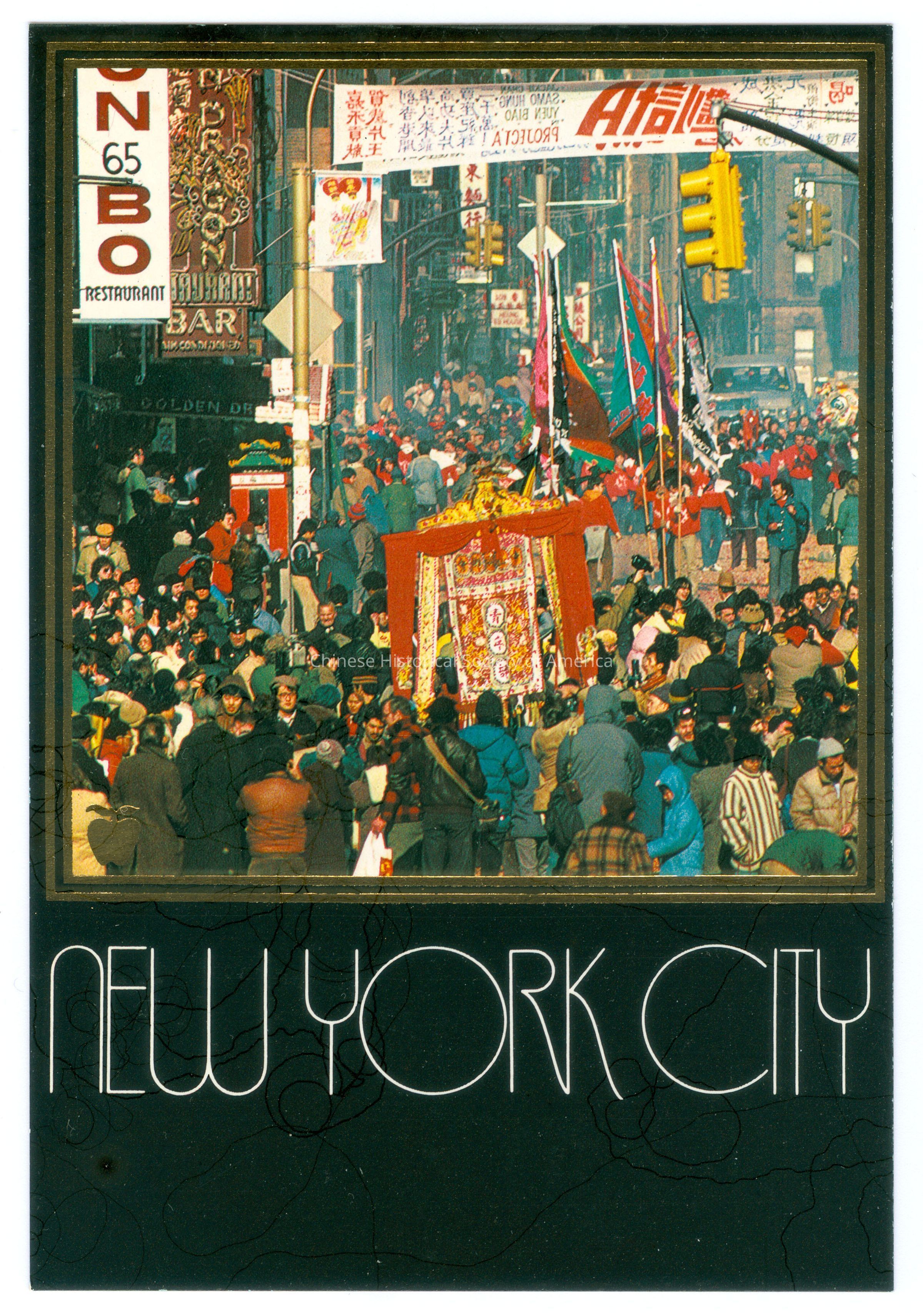 Color. Photo. New York; Chinatown: View of the street where there is a crowd of people, in the midst of the people is a parade where some people are holding green and red flags, there is also a red silk flag raised with gold trim.