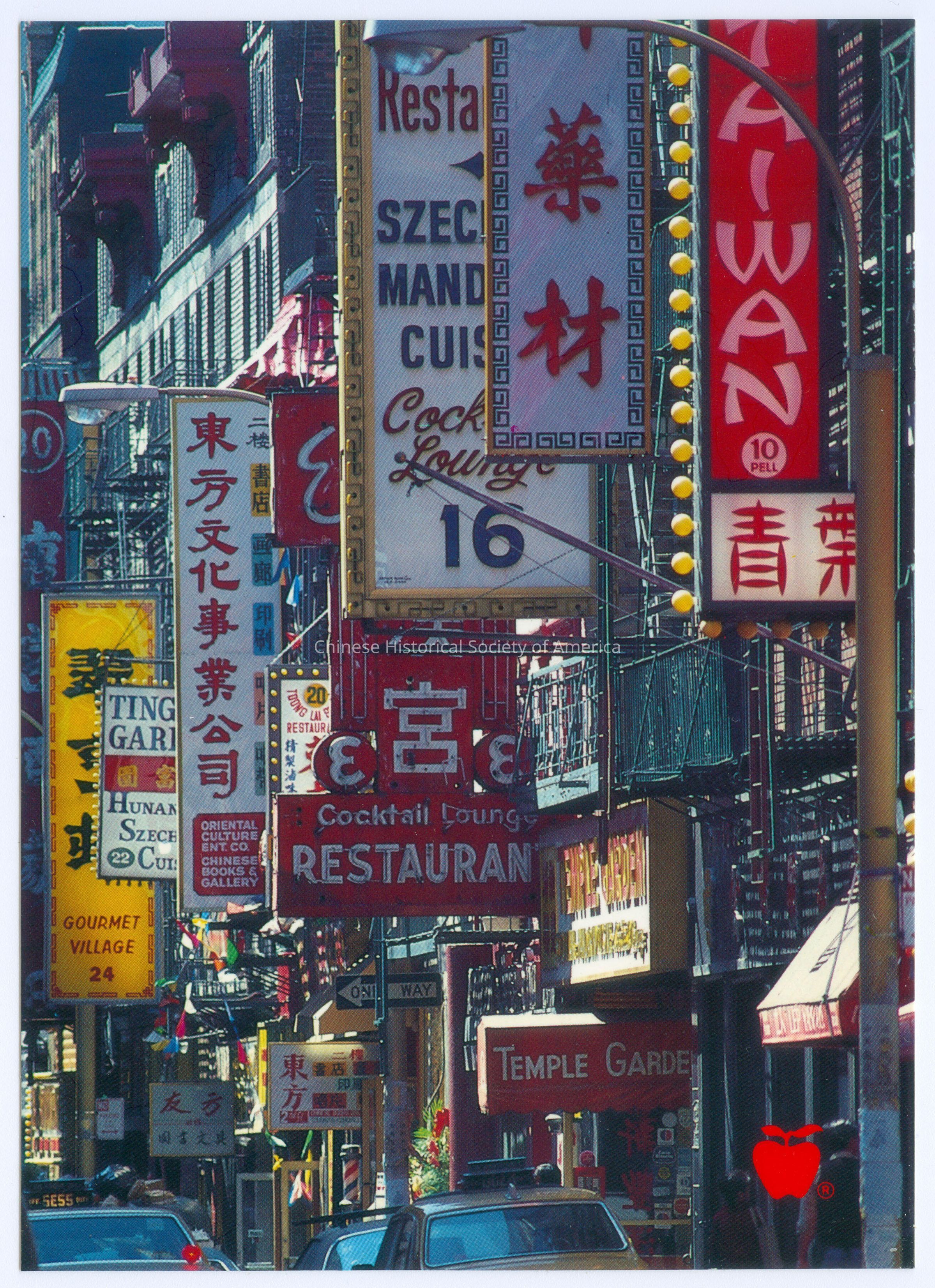 Back: Info. Text: "Chinatown, New York City. Centered in Pell and Mott Streets, this charming bit of the Far East winds through several narrow streets. Excellent oriental restaurants, gift shops, curio shops and markets featuring exotic foods from Asia are easily accessible."; "Pub. by Manhattan Post Card Pub. Co., Inc., 71-03 80th Street, Glendale, N.Y. 11385"; "Printed in Australia by Colorscans"; "Insist on genuine Apple Prints by Manhattan your assurance of quality"; "MPC" Old Accession #: N/A