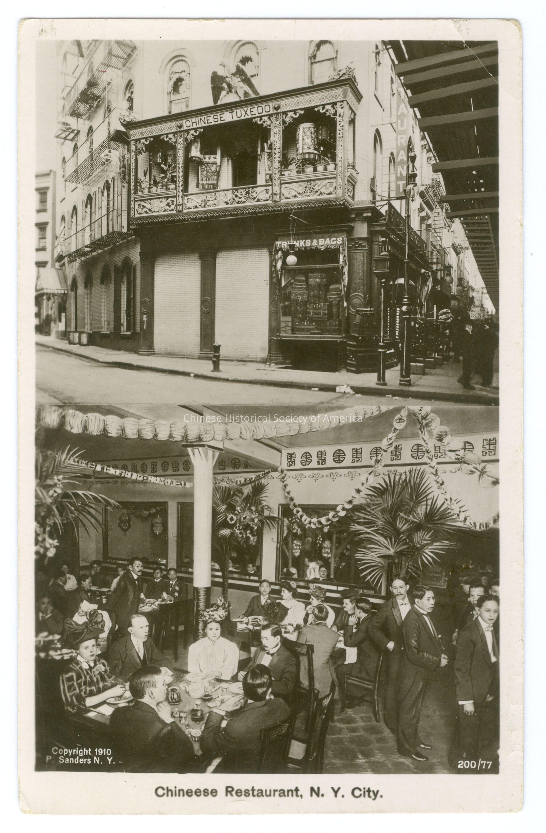 See CHSA-04732-33, CHSA-04782-04788. Front: Caption: "Chinese Restaurant, N.Y. City." "Copyright 1910 P. Sanders N.Y."; "200/77." Back: "This Card is a Real Photograph on Promide Paper." Old Accession #: D)-