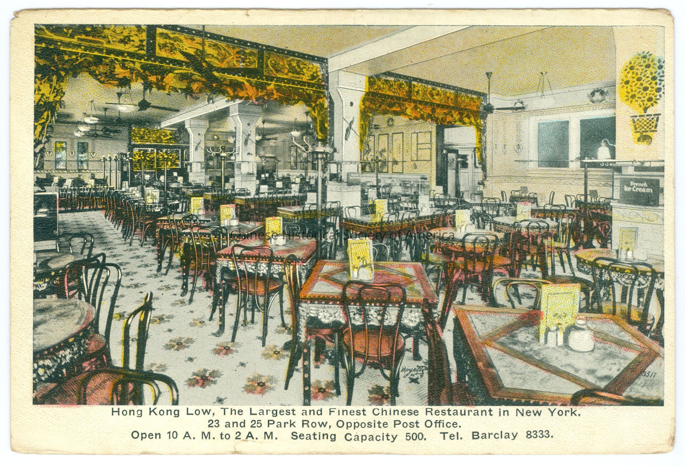 Front: Caption: "Hong Kong Low,The Largest and Finest Chinese Restaurant in New York. 23 and 25 Park Row, Opposite Post Office. Open 10 A.M. to 2 A.M. Seating capacity 500. Tel Barclay 8333." Back: "1.00", handwritten in pencil in the upper right hand. Old Accession #: D)-