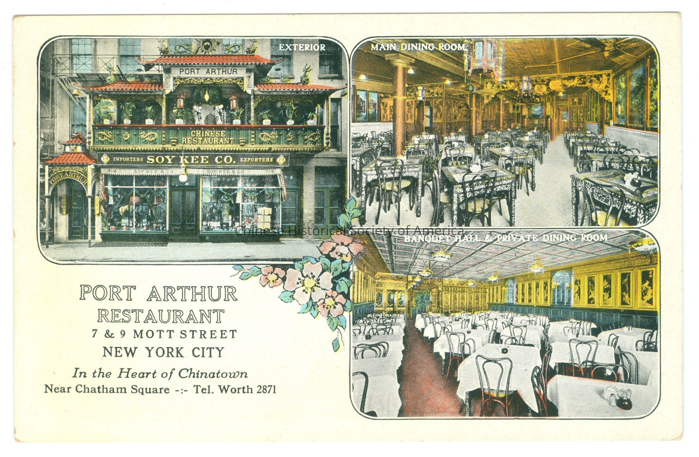 See CHSA-04724-04728. A-B: Front: Caption: "Exterior; Main Dining Room.; Banquet Hall & Dining Room."; "Port Arthur Restaurant 7 & 9 Mott Street New York City In the Heart of Chinatown Near Chatham Square - Tel. Worth 2871." A: Back: "Published by J. R. Mayers Co. New York. Made in USA"; "R82304" Old Accession #: TL)-