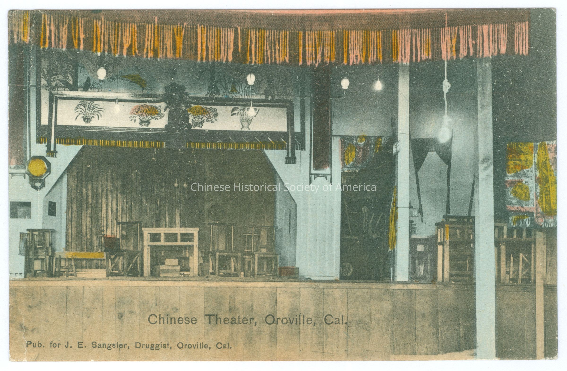 Front: Caption: "Chinese Theater, Oroville, Cal." "Pub. for J.E. Sangster, Druggist, Oroville, Cal." Back: Postmark: "May 18 1909 7:30 PM", stamped in black. Stamp: A green one cent stamp with a side picture of Benjamin Franklin, "U.S. Postage, One