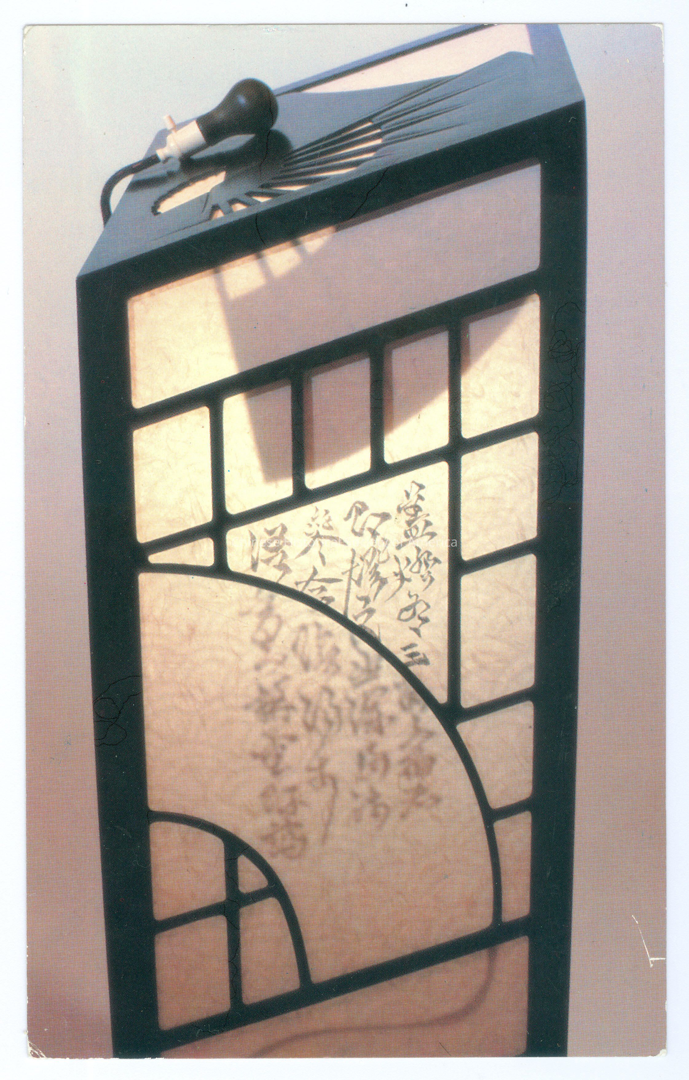 Color. Photo. California; Pasadena; Pacific Asia Museum Introductory Card: A black trim silk screen podium with Japanese characters written on the screen, there is also a black bulb lying on the podium.