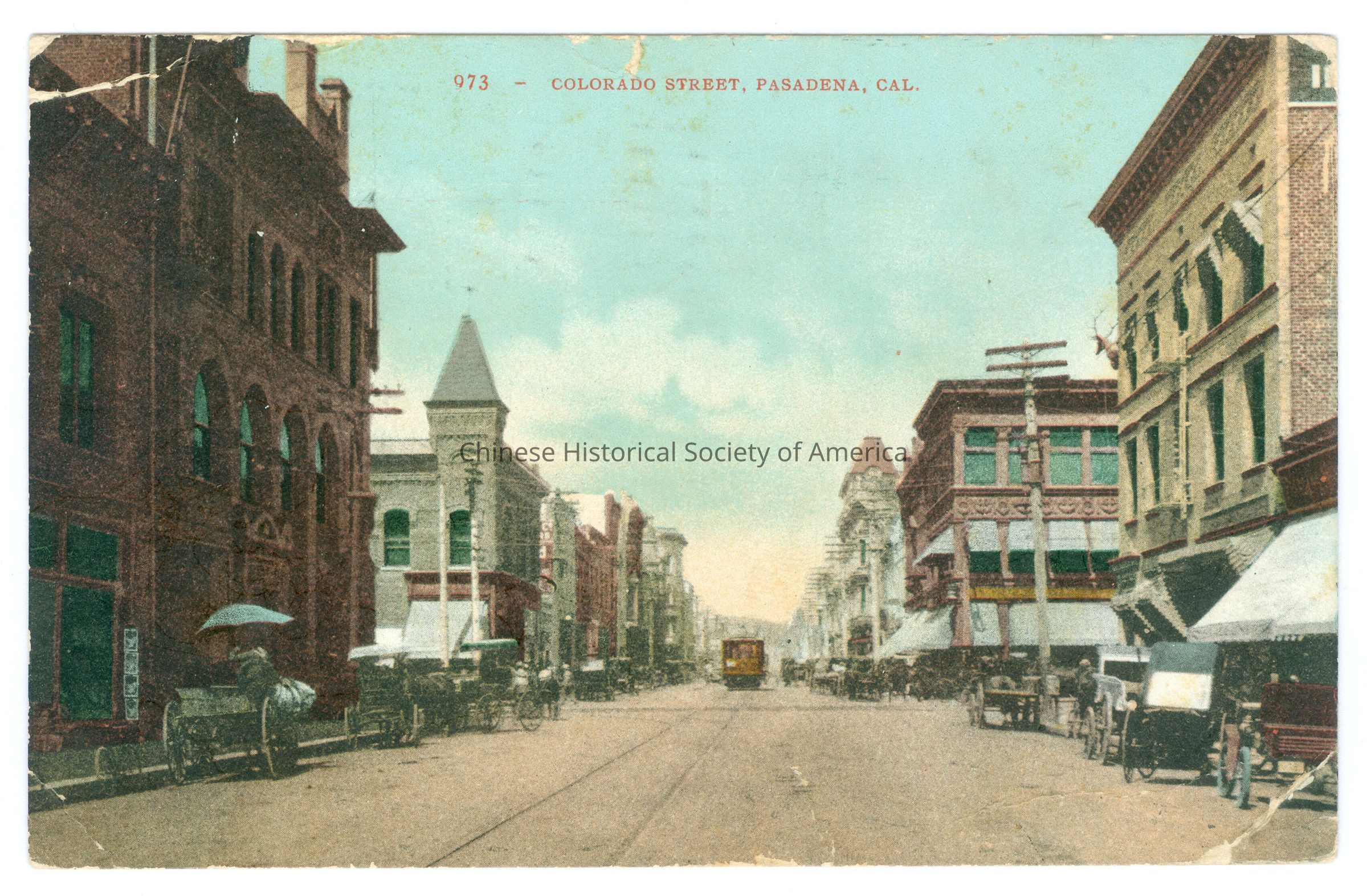 Color. Photo. California; Pasadena; Street Scene: View of the street with buildings on both sides, there are horse drawn carriages parked on both sides of the sidewalk and a trolley line running down the street and a trolley coming down the street.