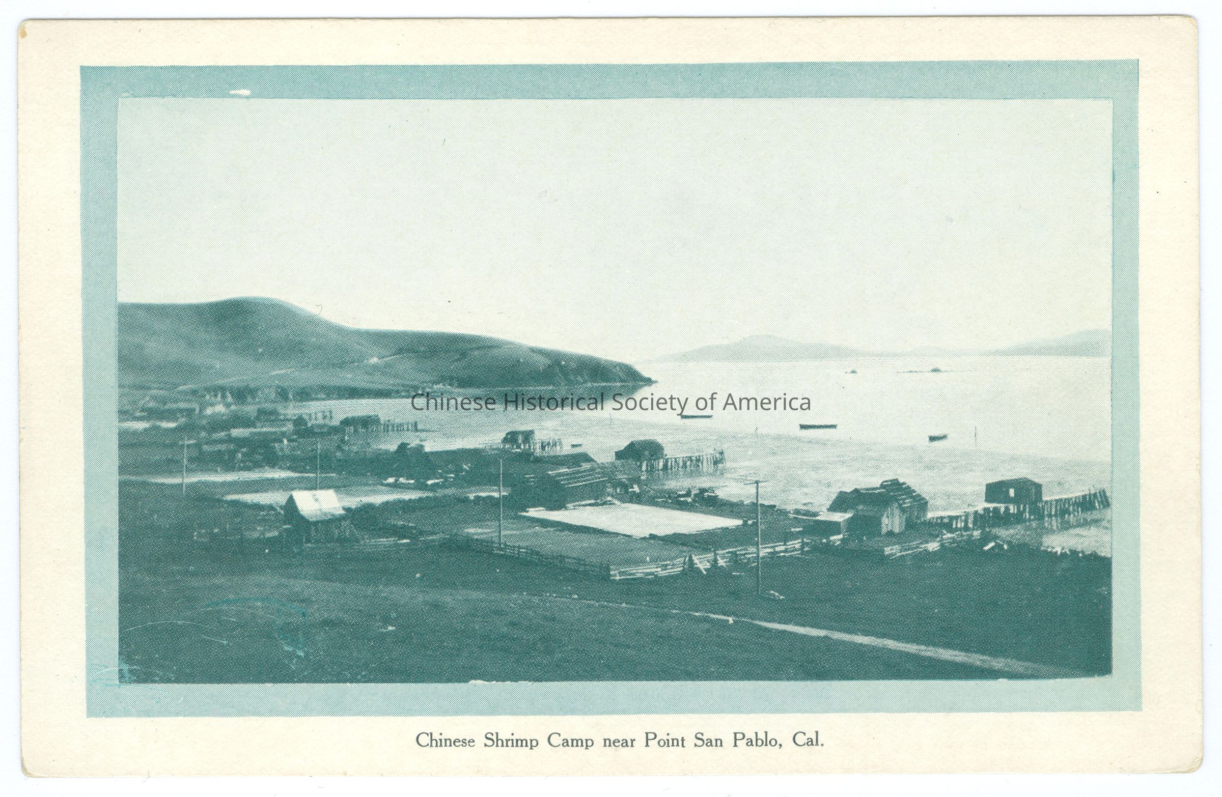 Front: Caption: "Chinese Shrimp Camp near Point San Pablo, Cal." Back: "Published for The Richmond Chamber of Commerice, by the Polychrome Co., San Francisco, Cal." Old Accession #: DLEX