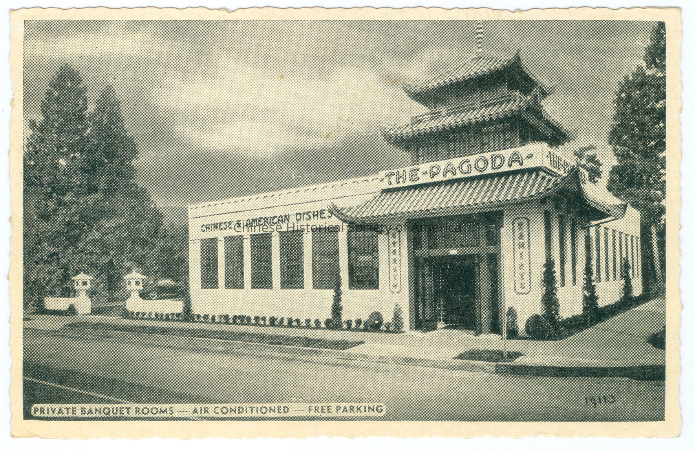Front: Caption: "Private Banquet Rooms - Air Conditioned - Free Parking." "19113." Back: Info. Text: "The Pagoda..3839 N.E. Broadway, - Portland, Ore. We Cater To Private and Special Parties Call Go 5887." "Picto-Card - Kaeser & Blar, Inc., Cincinnati, Ohio." Old Accession #: D)-