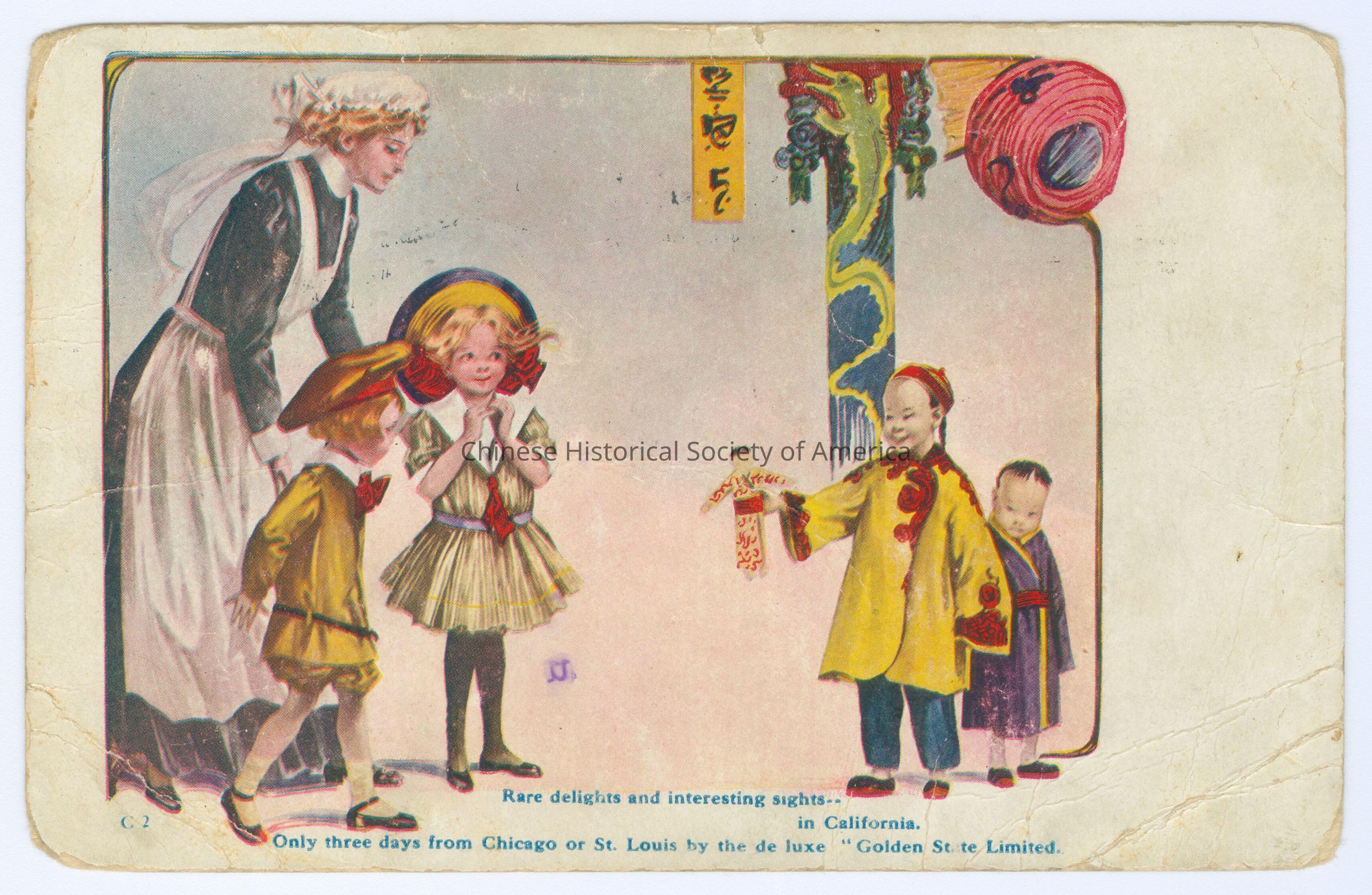 Color. Illus. California; Children: There is a White woman nurse pushing 2 White girls in dresses toward a Chinese boy with a que who is holding a Chinese doll out to them, another little Chinese boy is standing behind him.