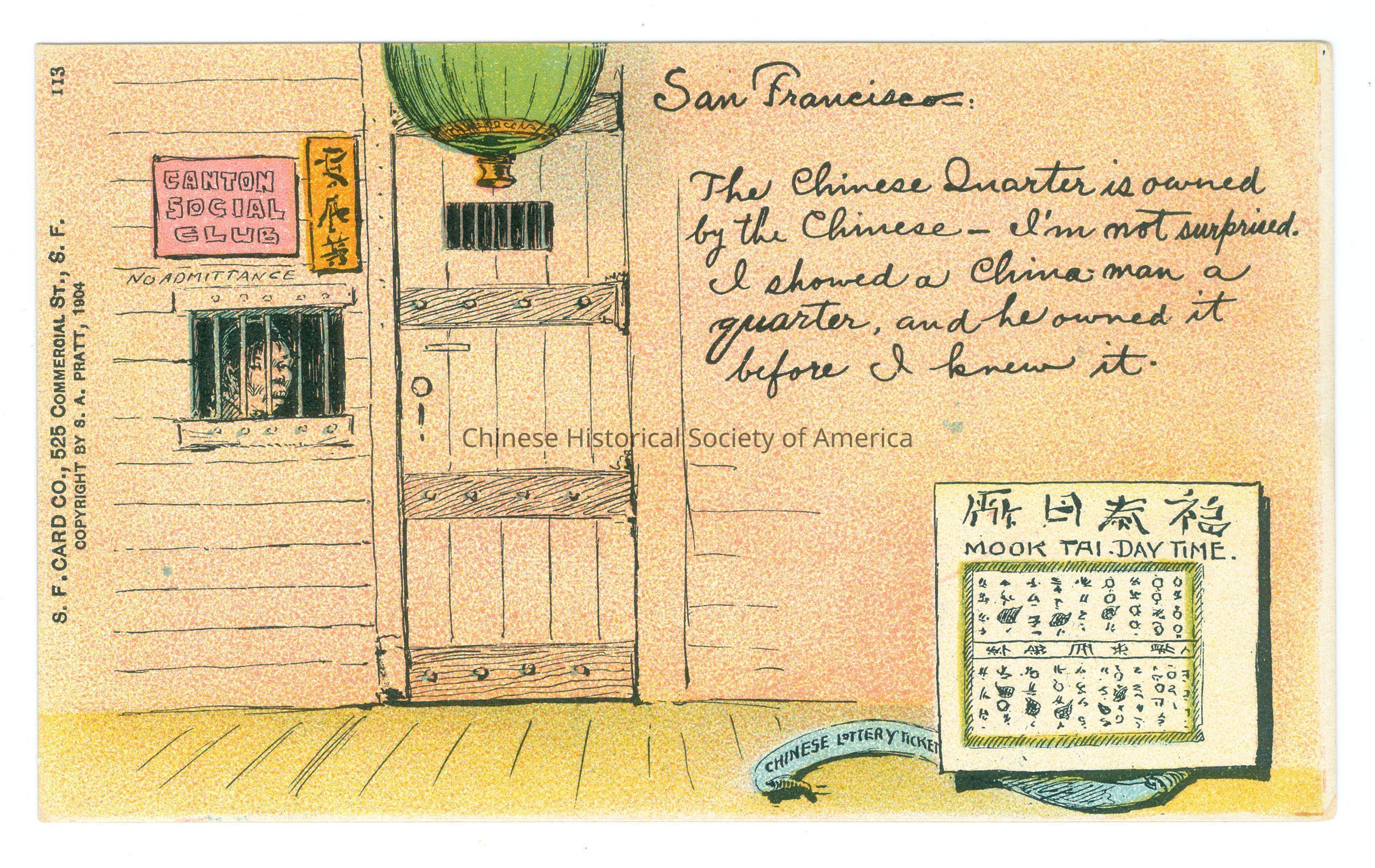 A: Front: Caption: "San Francisco: The Chinese Quarter is owned by the Chinese-I'm not surprised. I showed a China-man a quarter, and he owned it before I knew it." "S.F. Card Co., 525 Commercial St., S.F. Copyright By S.A. Pratt, 1904 113." Back: "1904" in pencil. Old Accession #: L)