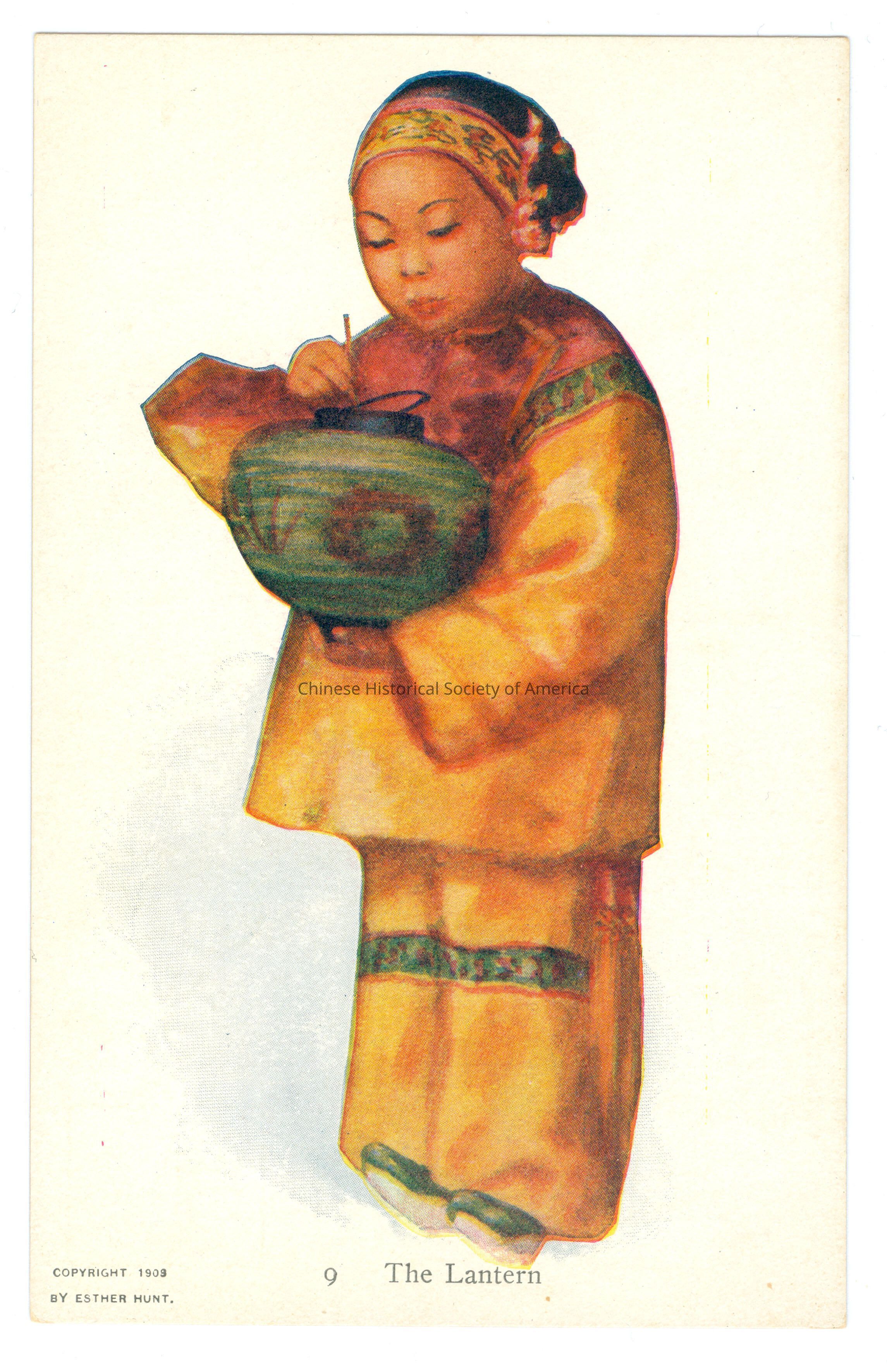 A: Front: Caption: "9 The Lantern." "Copyright 1909 By Esther Hunt." Back: "National Art Company Trade Mark." Old Accession#: DET.Dimensions