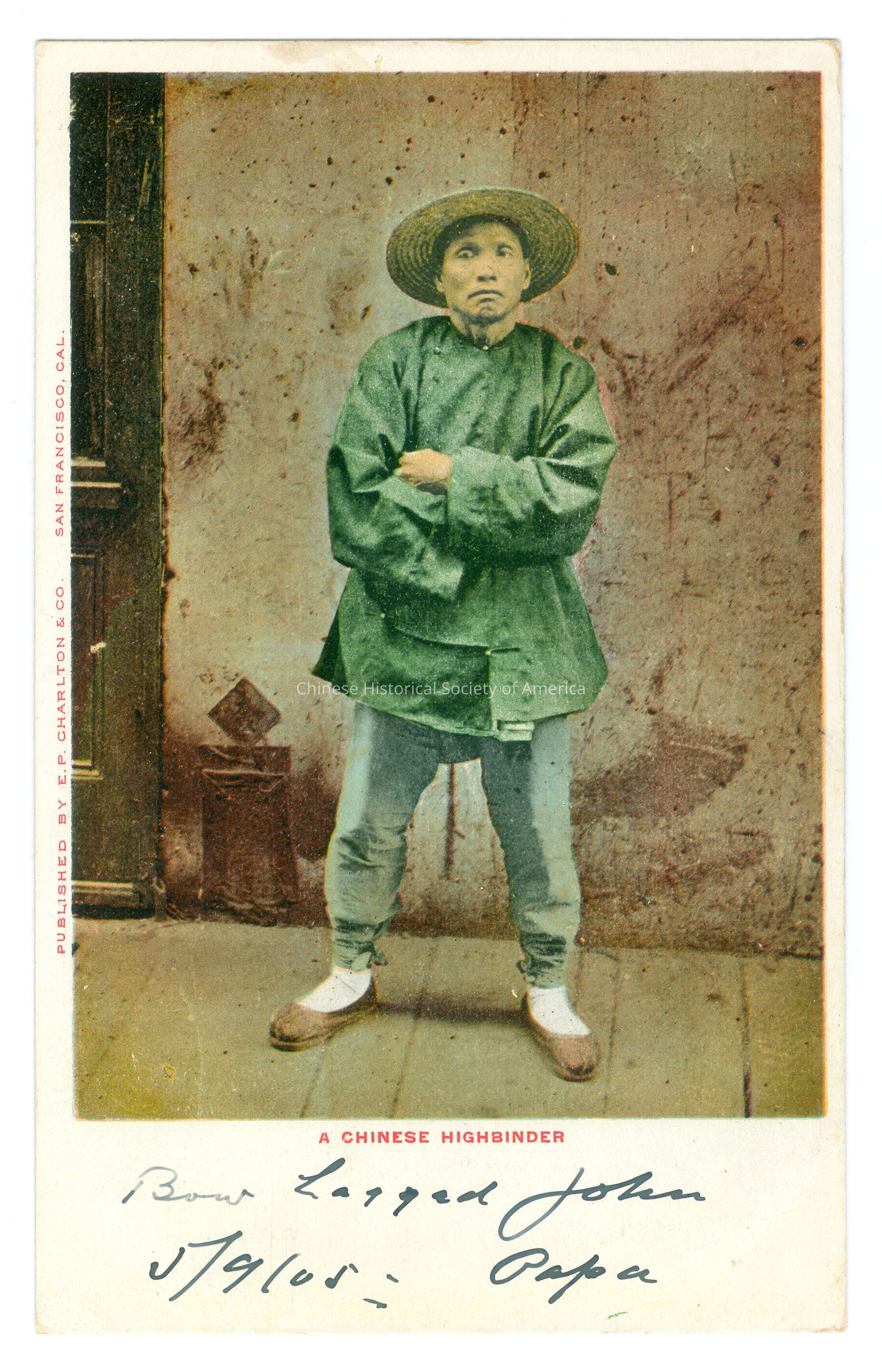 A: Front: Caption: "A Chinese Highbinder." Message: "Bow Legged John 5/9/05: Papa", handwritten in black. "Published By E.P. Charlton & Co. San Francisco, Cal." Back: Postmark: "San Francisco, Cal. May 9 1905 4:30 PM", stamped in black. Stamp: Stamp with Benjamin Franklin's image. "One Cent Postage"