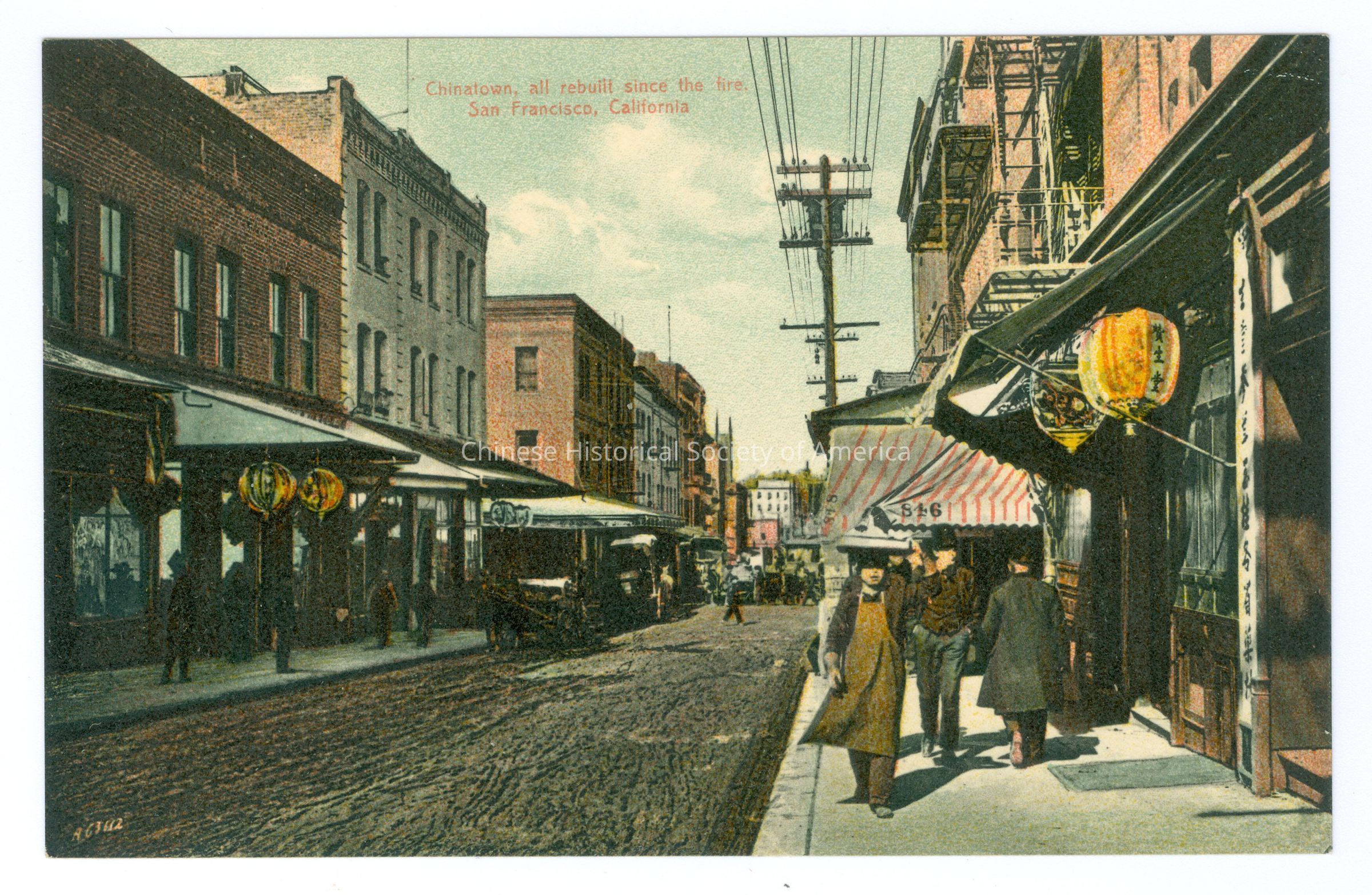 A-B: Front: Caption: "Chinatown, all rebuilt since the fire. San Francisco, California." "AG3112." A: Back: "Chas, Weidner, Postcard Publisher, San Francisco, Cal. No. 599, Made in Germany." Old Accession #: GN)-.