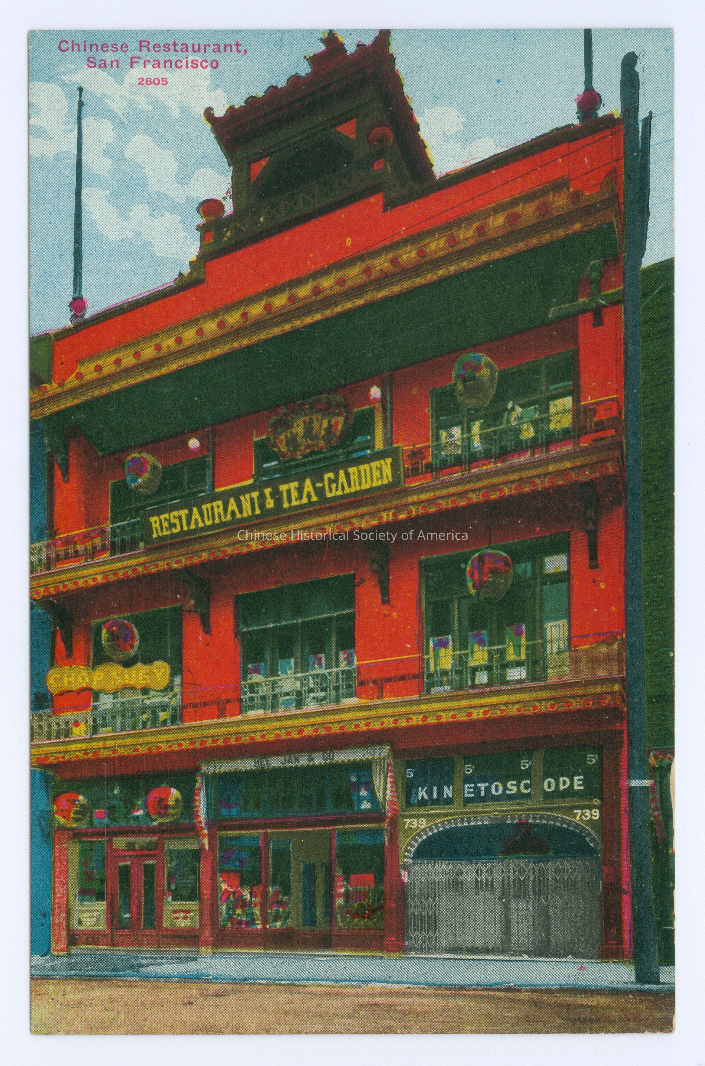 A: Front: Caption: "Chinese Restaurant, San Francisco 2805". Back: "Pacific Novelty Co. San Francisco and Los Angeles".